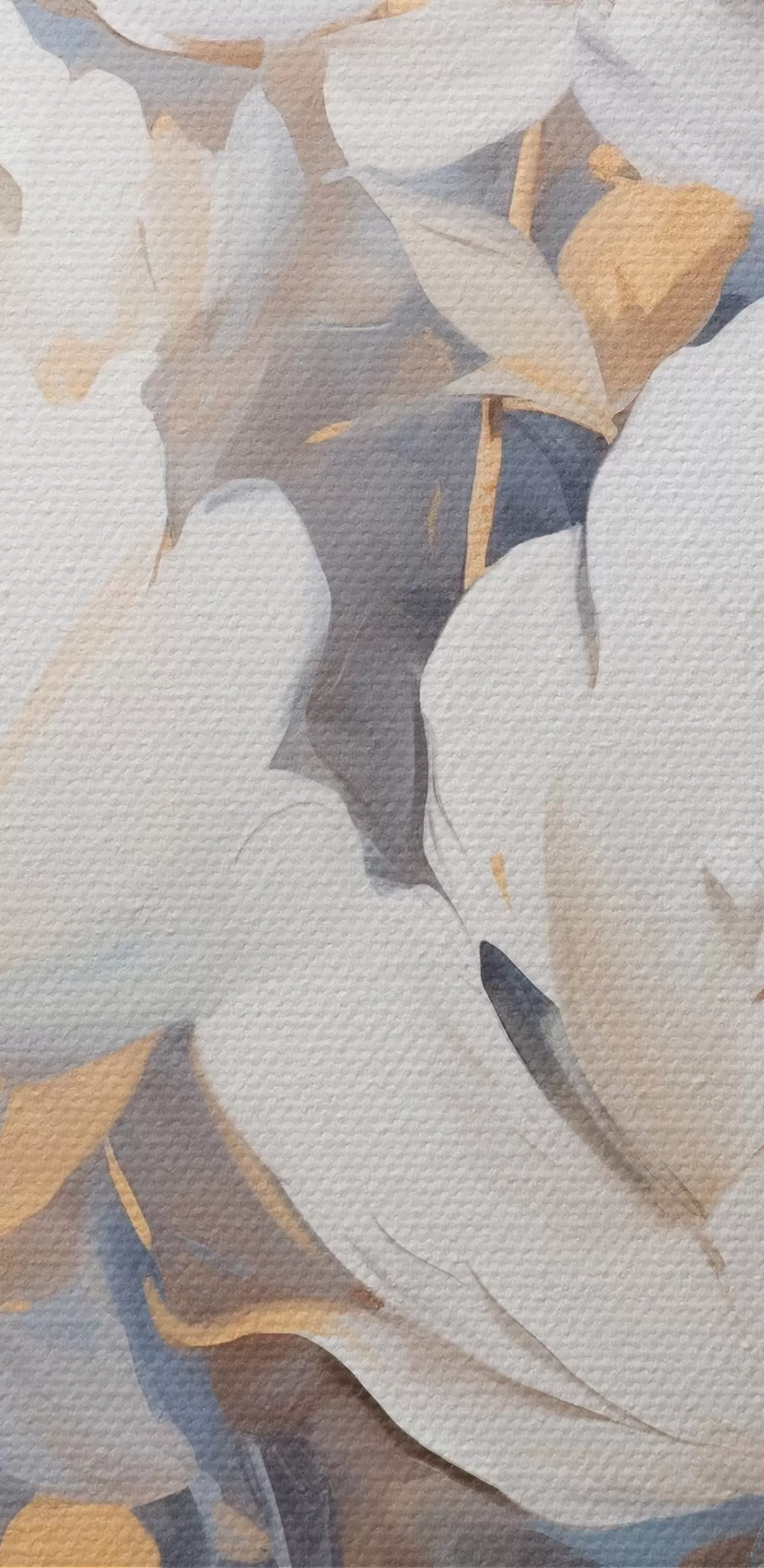 Peinture Pivoines blanches avec centre et feuilles jaunes, coups de pinceau doux, fond bleu clair, composition florale Art. m00878