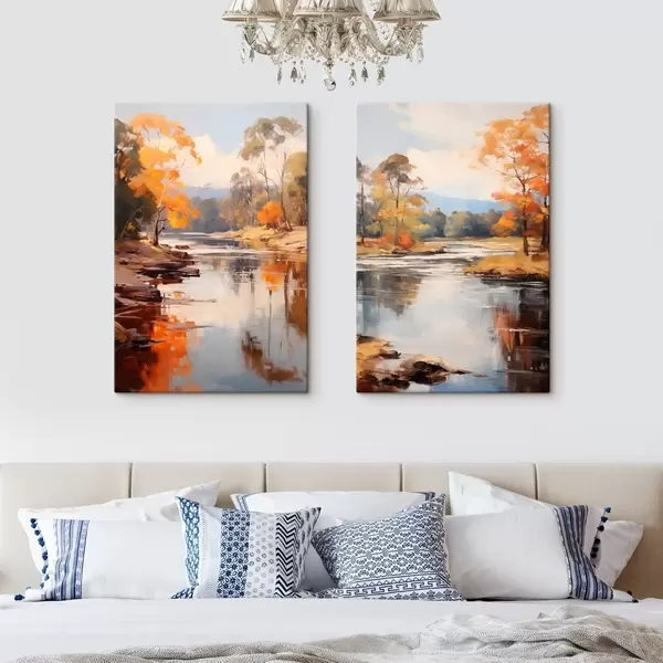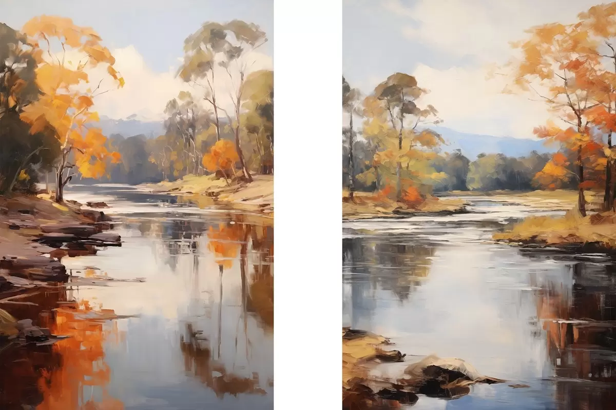 Peinture Paysage automnal, rivière bordée d'arbres, forêt en arrière-plan, reflets sur l'eau Art. m00883
