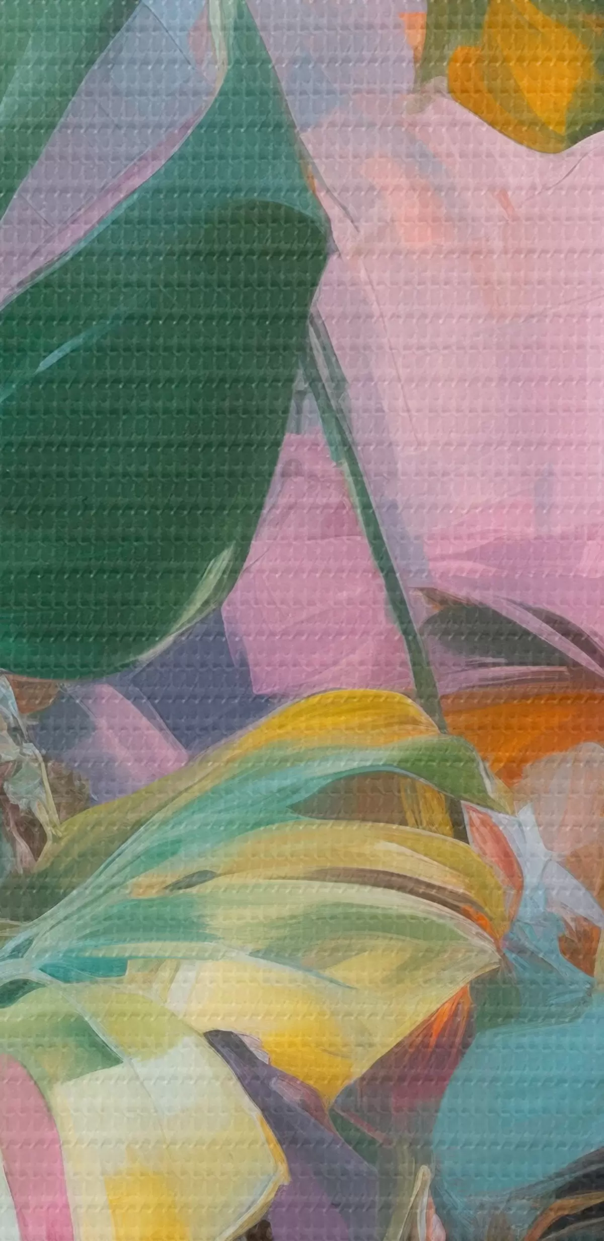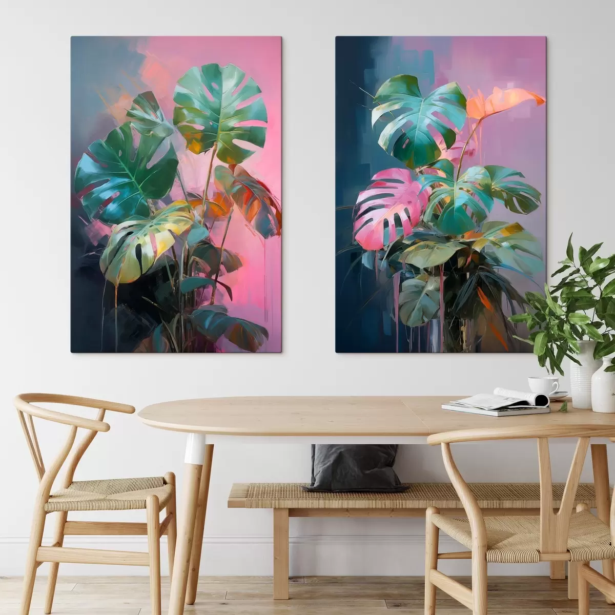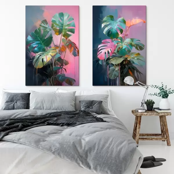 Peintures Plante abstraite monstera aux feuilles d'un vert éclatant, sur fond de douces teintes roses et violettes m00886