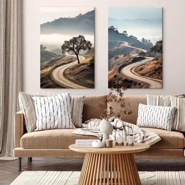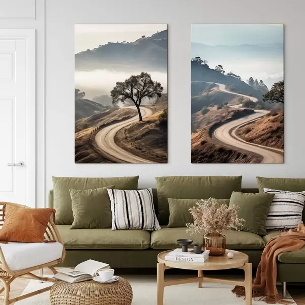 Peintures Une route sinueuse à travers un paysage vallonné recouvert d'herbe sèche, sous un ciel clair, avec des montagnes au loin m00887