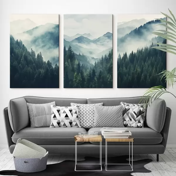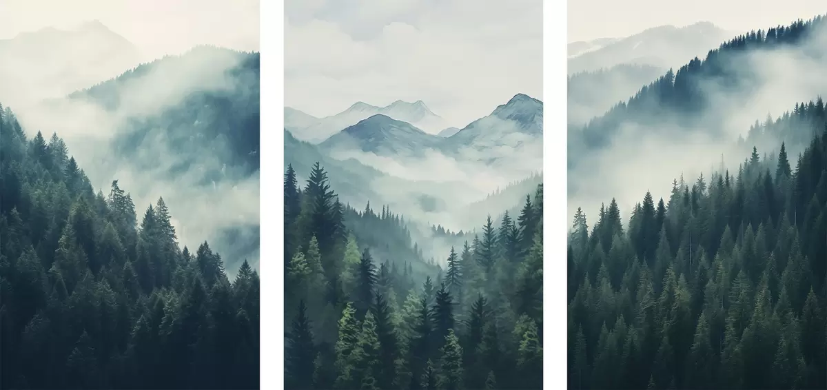 Peintures Des montagnes brumeuses couvertes de pins, parsemées de tons verts et bleus doux. m00964