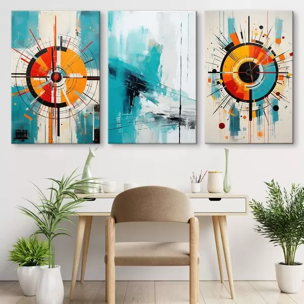 Peinture Abstrait radial avec éclats bleu sarcelle et orange Art. m00973