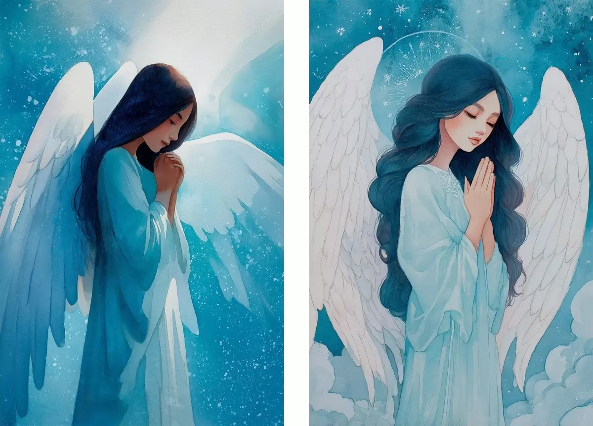 Peinture Art sacré moderne dans un style aquarelle représentant un ange gardien vêtu d'une robe bleue. Art. m01153