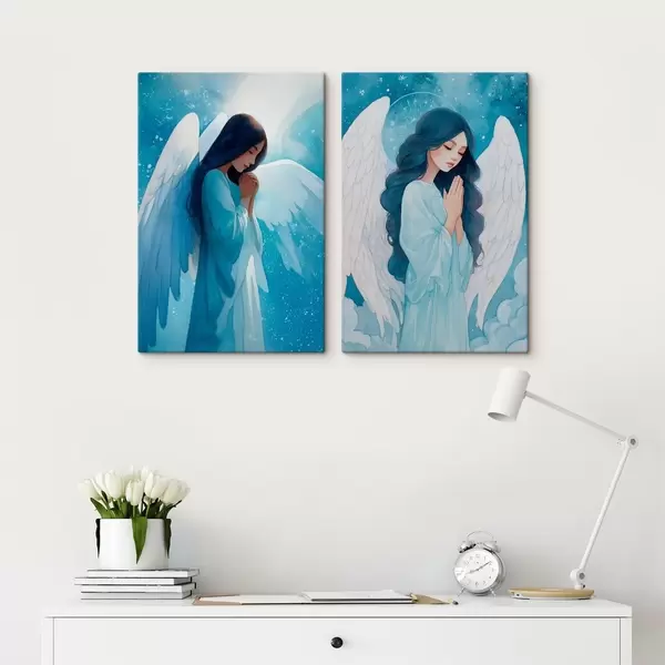 Peintures Art sacré moderne dans un style aquarelle représentant un ange gardien vêtu d'une robe bleue. m01153