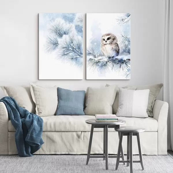 Peinture Jolie chouette sur une branche de pin enneigée, peinte à l'aquarelle Art. m01168