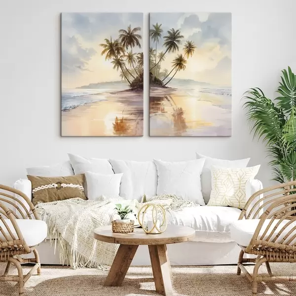 Peinture plage au coucher du soleil sur une île, style aquarelle Art. m01177