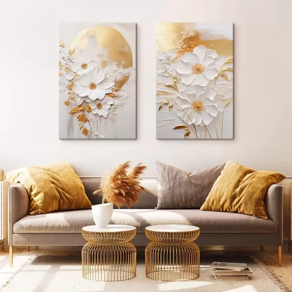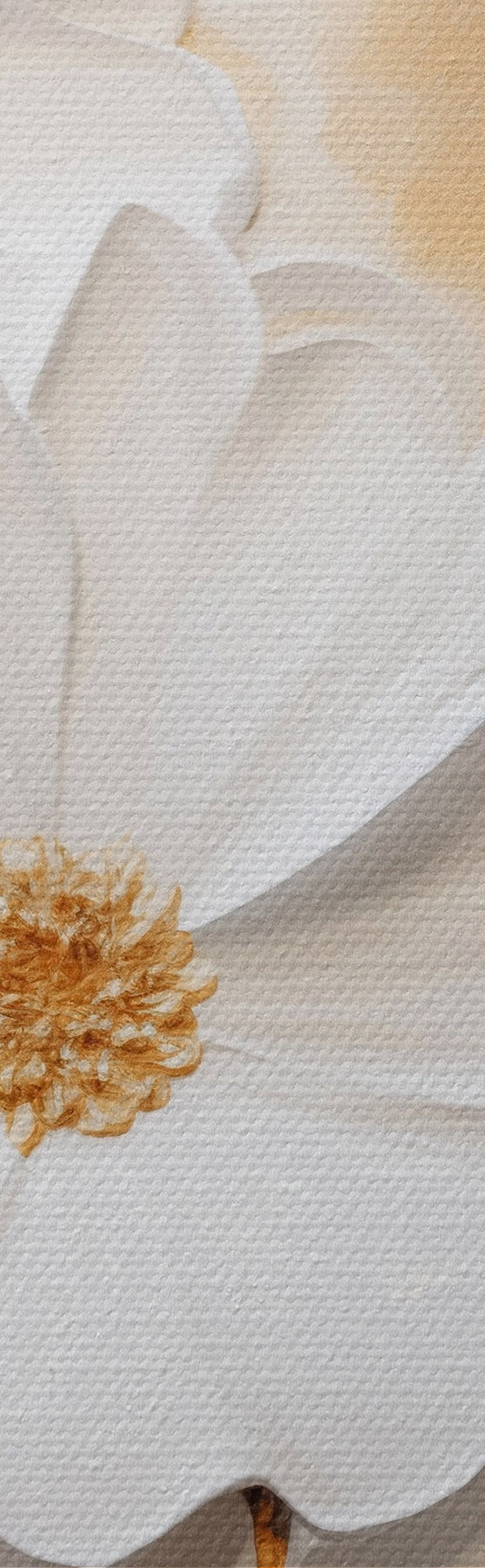 Peinture Fleurs blanches rehaussées de touches jaunes et feuilles délicates sur fond texturé, art moderne Art. m01233