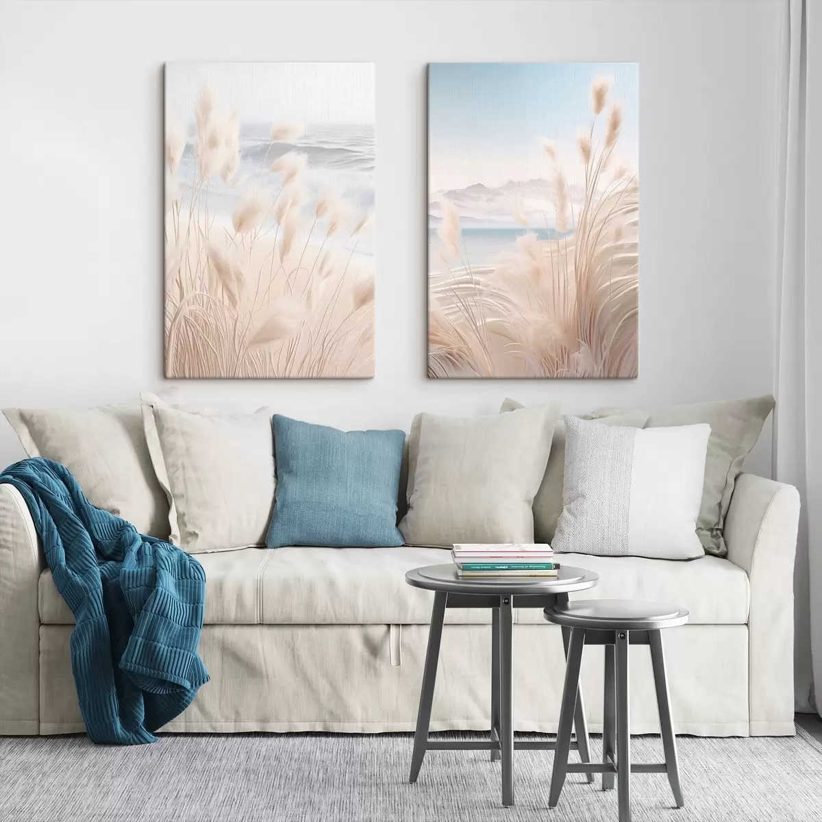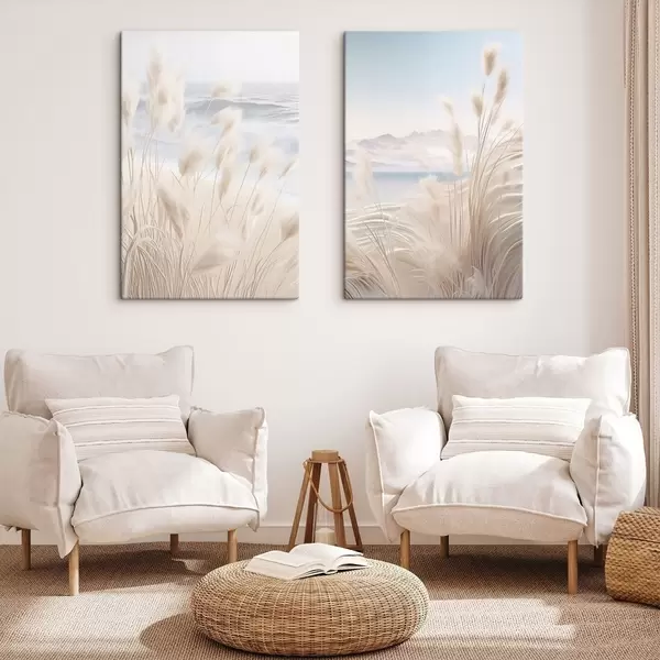Peintures Haute herbe de pampa plumeuse dans des tons beiges doux au premier plan, avec une plage de sable en arrière-plan. m01242