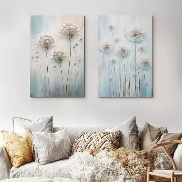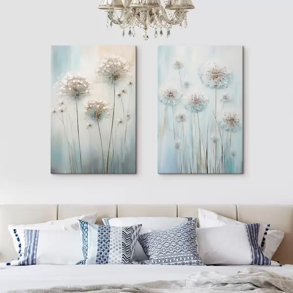 Peintures Style pictural texturé représentant des pissenlits sur un fond bleu et blanc doux m30048
