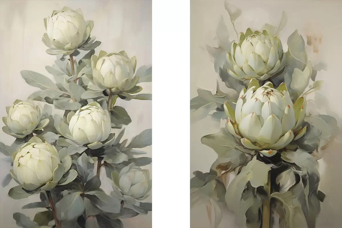 Peinture Style pictural représentant plusieurs fleurs de protéa blanches avec de grandes feuilles vertes sur un fond clair. Art. m30051