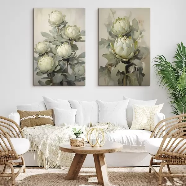 Peintures Style pictural représentant plusieurs fleurs de protéa blanches avec de grandes feuilles vertes sur un fond clair. m30051