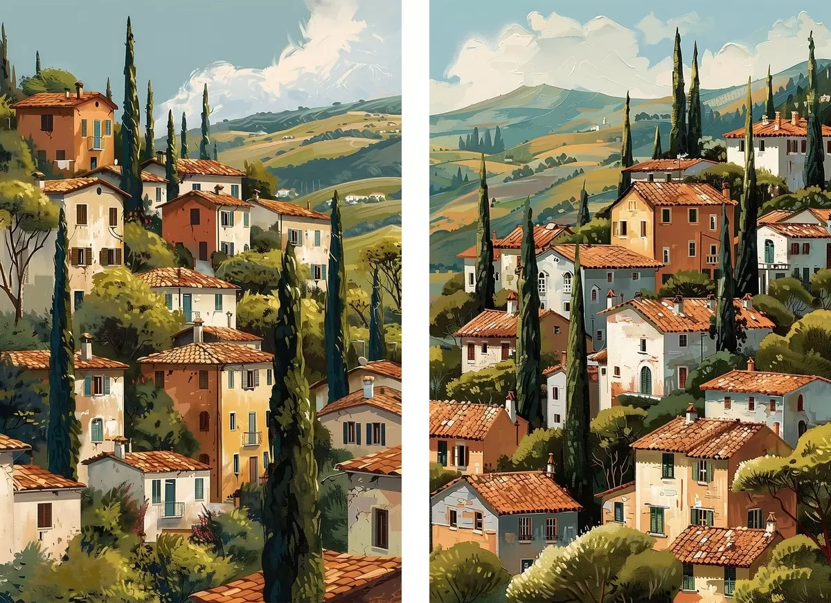Peintures village méditerranéen à flanc de colline, maisons aux tons chauds empilées les unes sur les autres avec des toits en terre cuite m30097