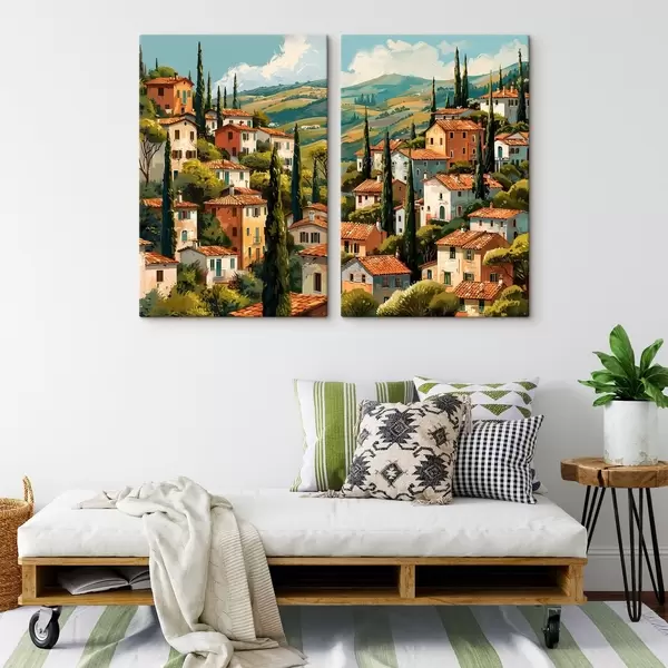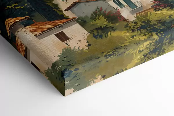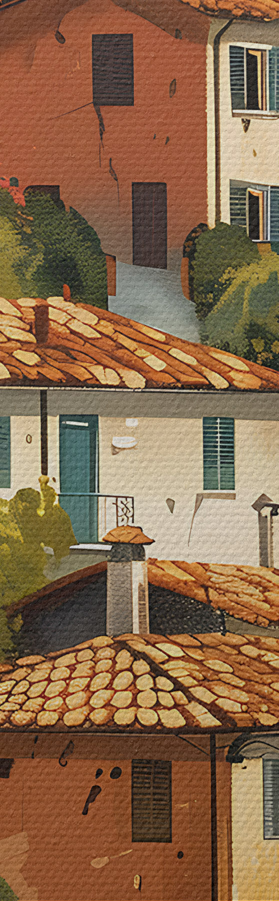 Peinture village méditerranéen à flanc de colline, maisons aux tons chauds empilées les unes sur les autres avec des toits en terre cuite Art. m30097