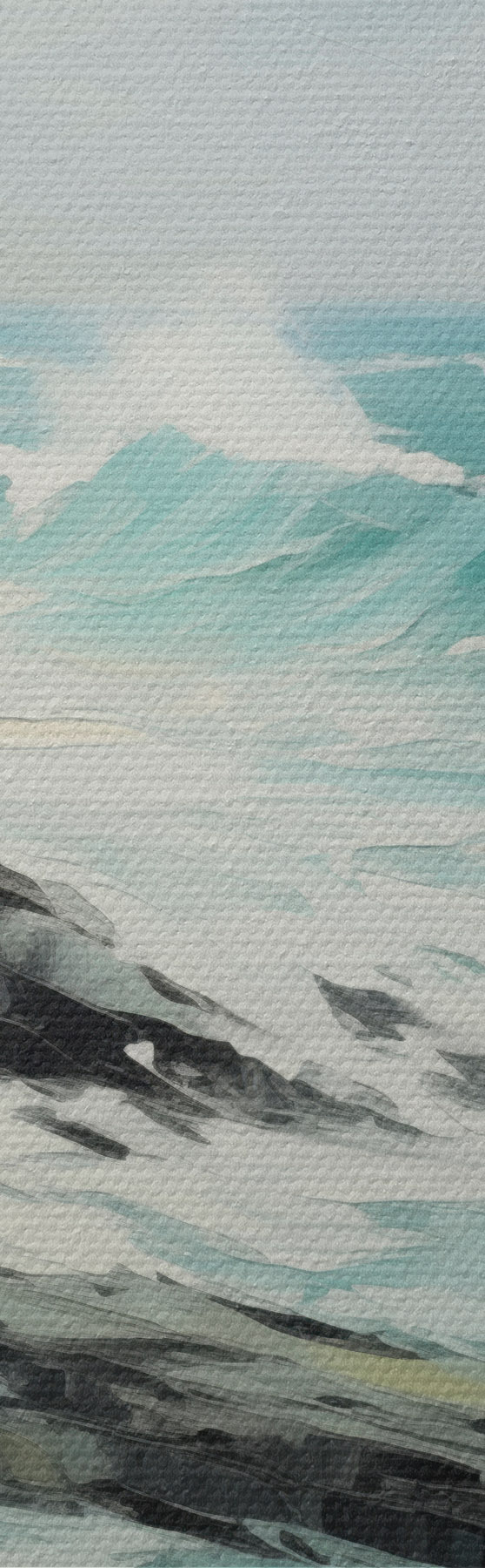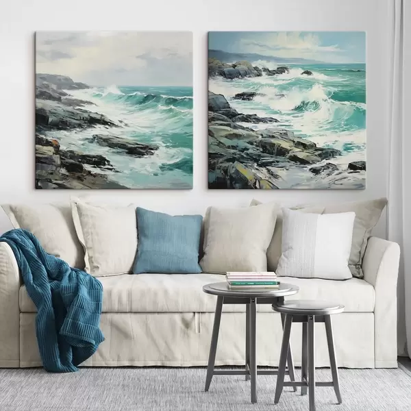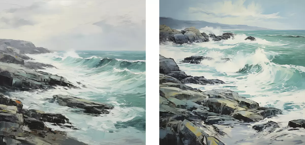 Peinture Un paysage de côte rocheuse avec des vagues sous un ciel nuageux, style peinture Art. m30198
