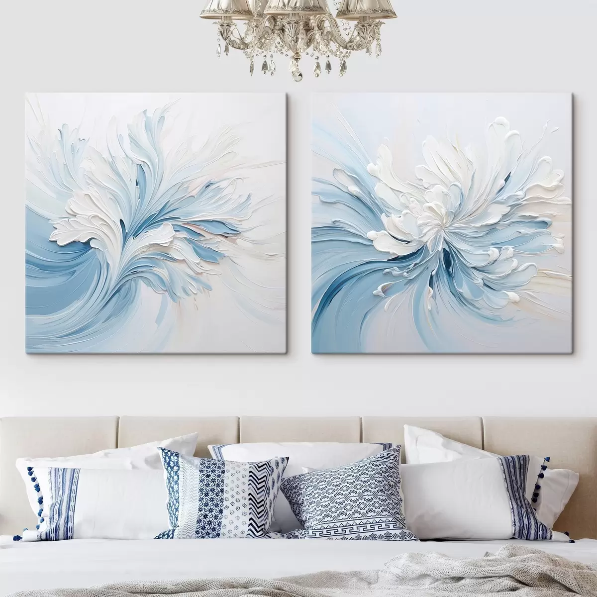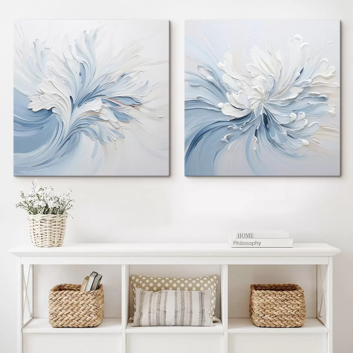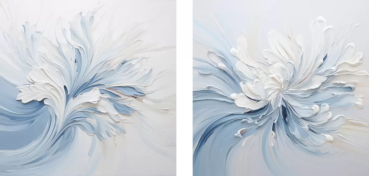 Peinture Un motif floral abstrait blanc et bleu clair, composé de pétales texturés et de lignes sinueuses Art. m30202