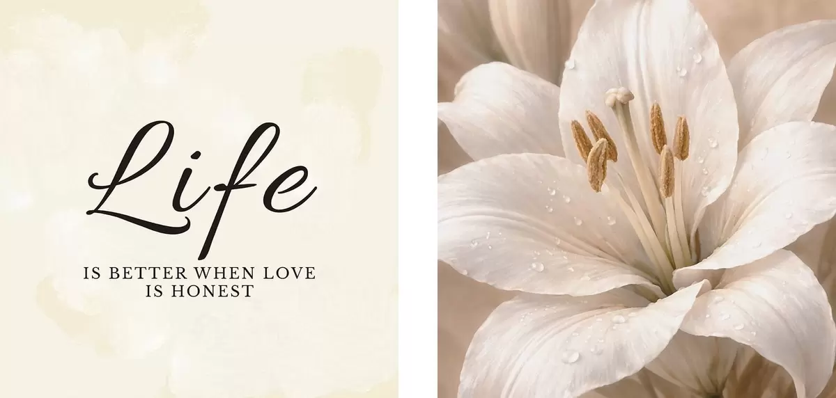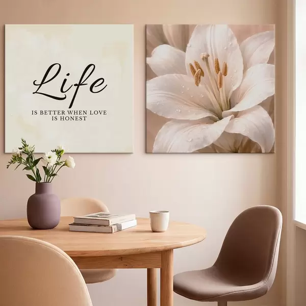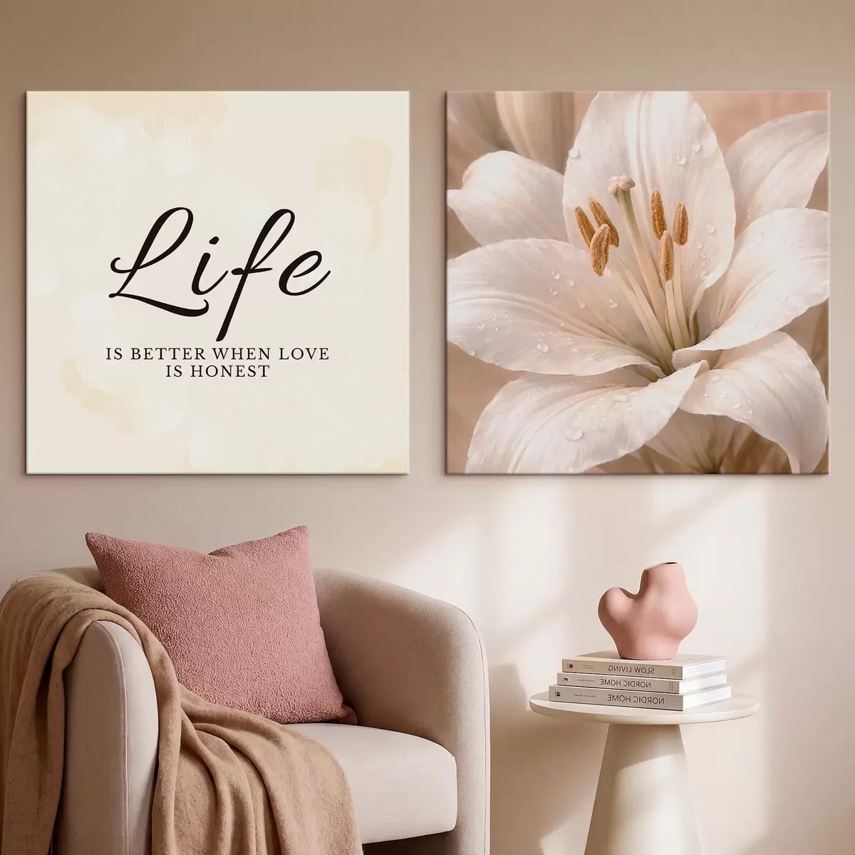 Peinture Diptyque avec le texte « Life » et un gros plan sur une fleur blanche Art. m30237