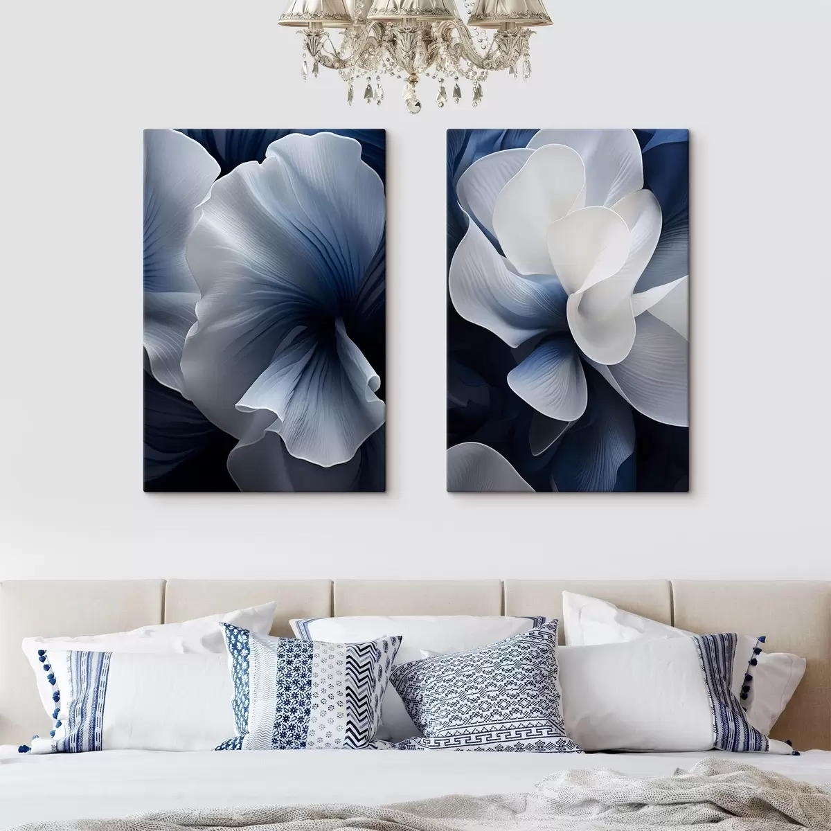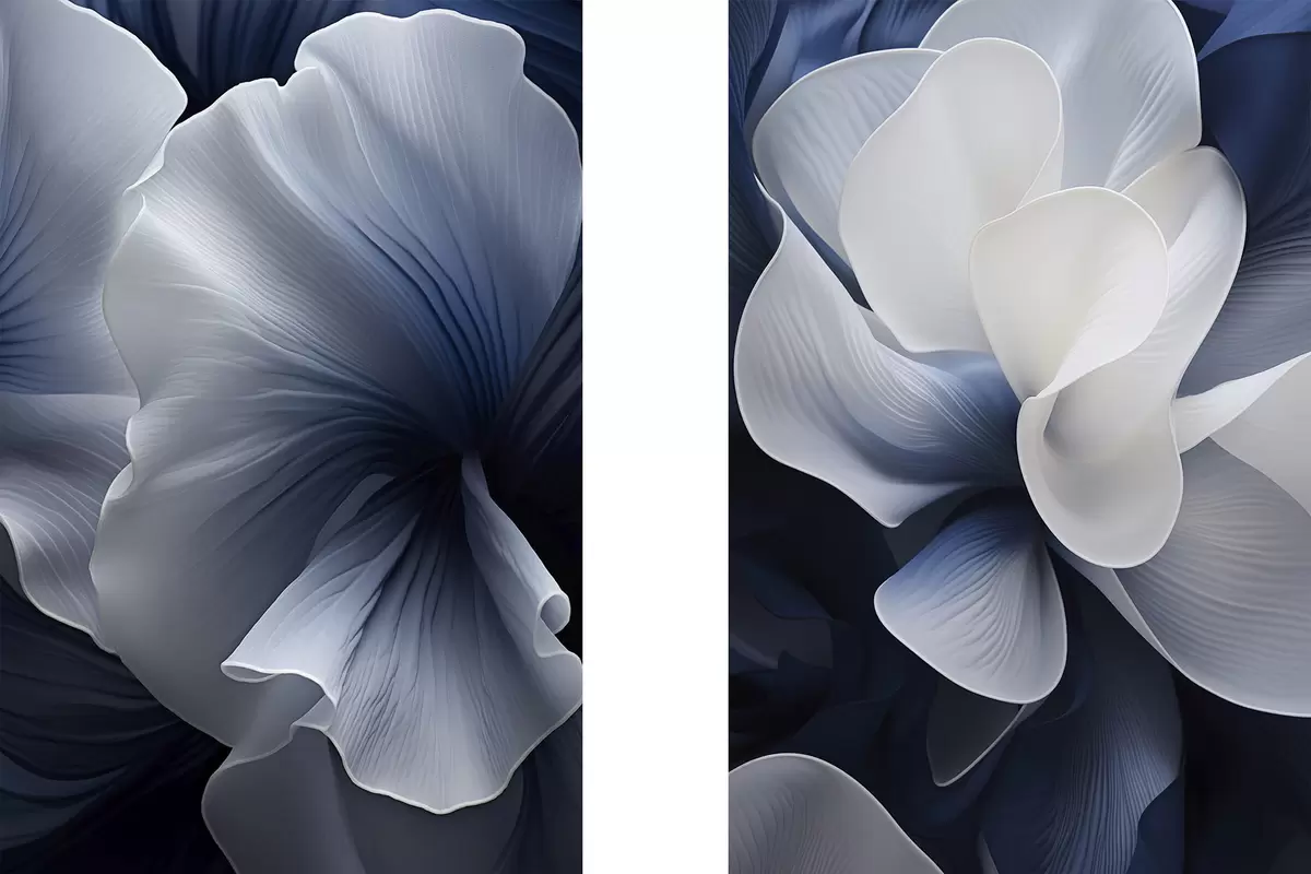 Peintures Pétales de fleurs abstraites bleues et blanches sur fond sombre m30316