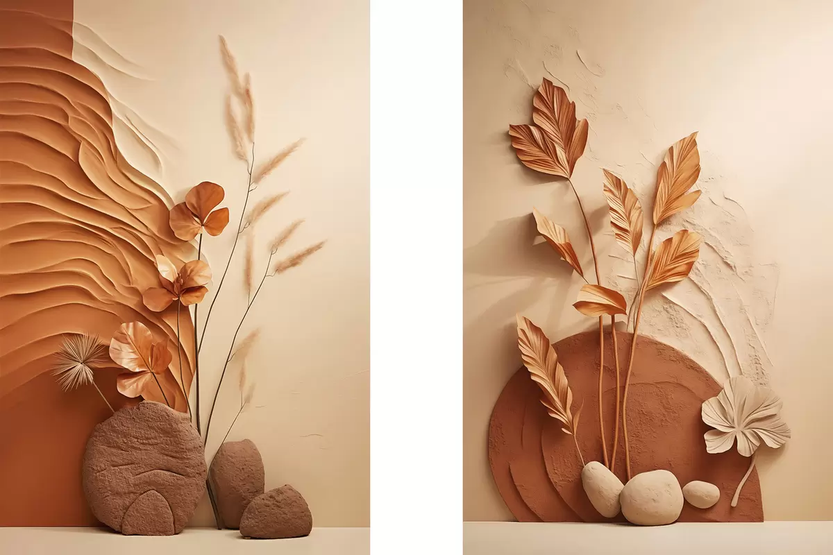 Peintures Une œuvre minimaliste composée de fleurs séchées et d'herbe de la pampa, sur un fond texturé m30320
