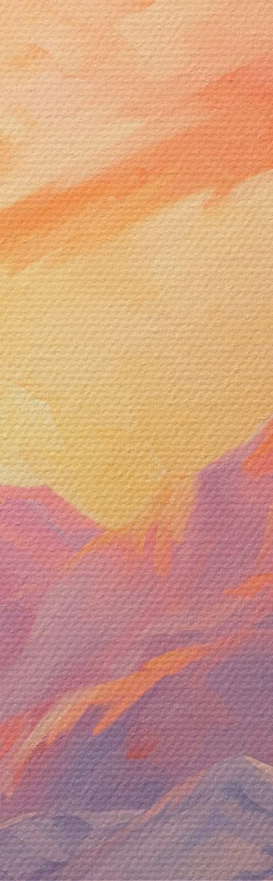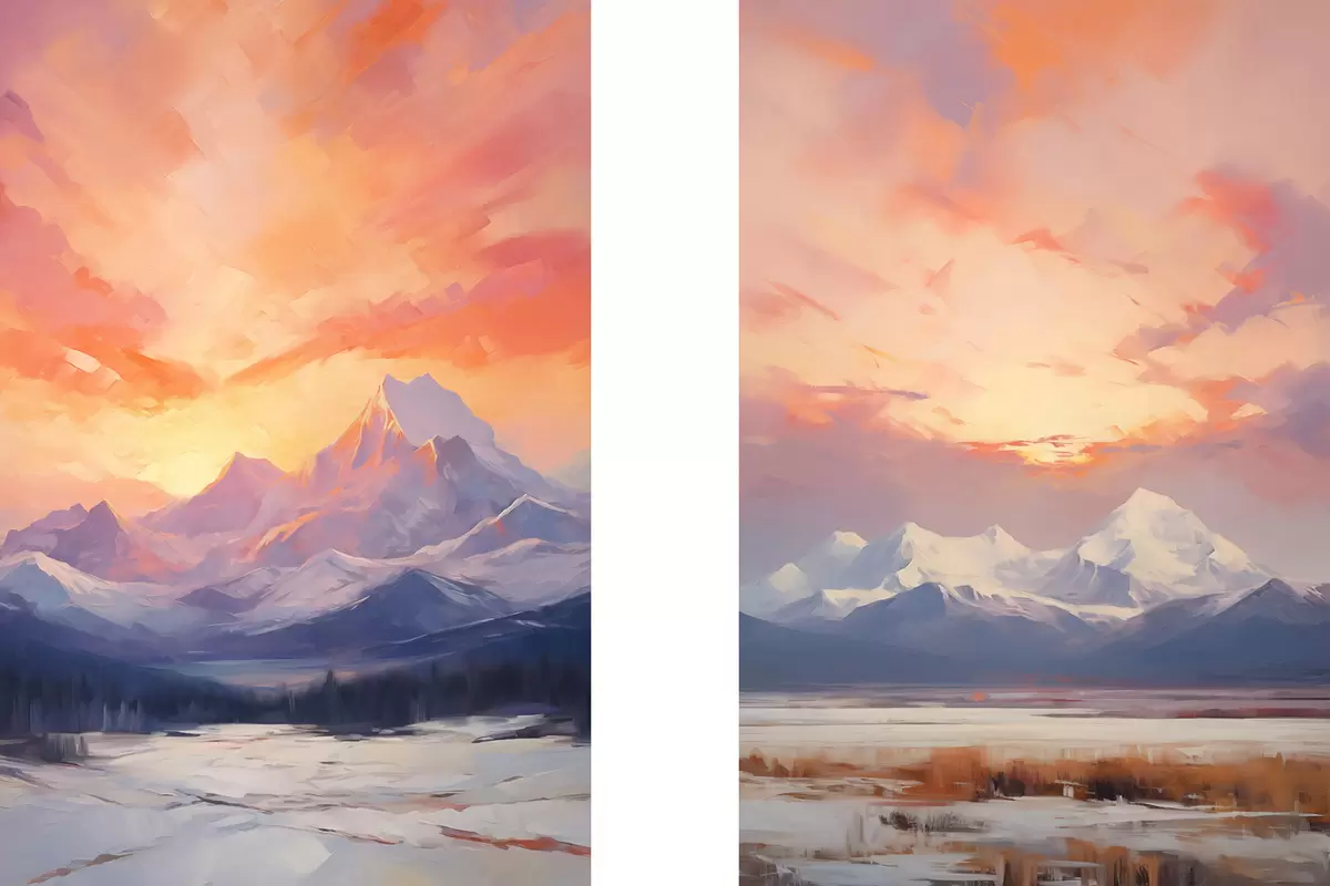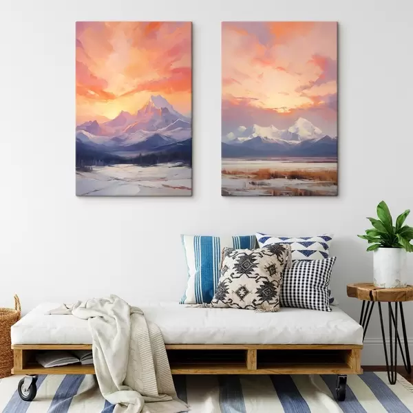 Peinture Des montagnes aux sommets enneigés sous un ciel aux teintes vives d'orange et de rose, parsemé de nuages Art. m30321