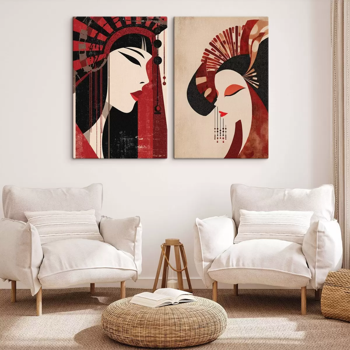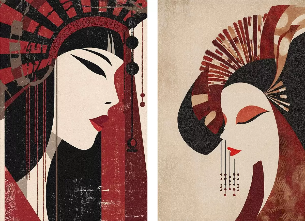 Peintures portrait stylisé d'une femme, inspiré des esthétiques japonaise et Art déco m30431