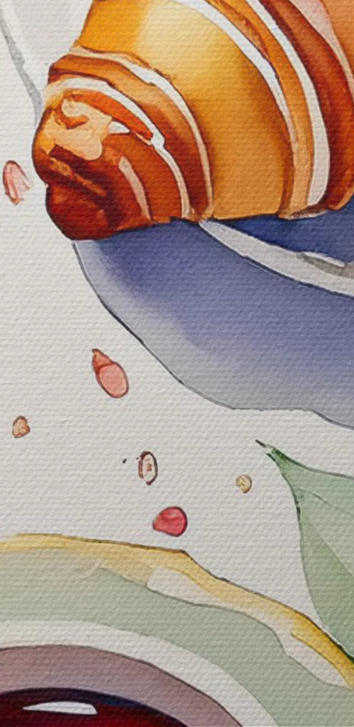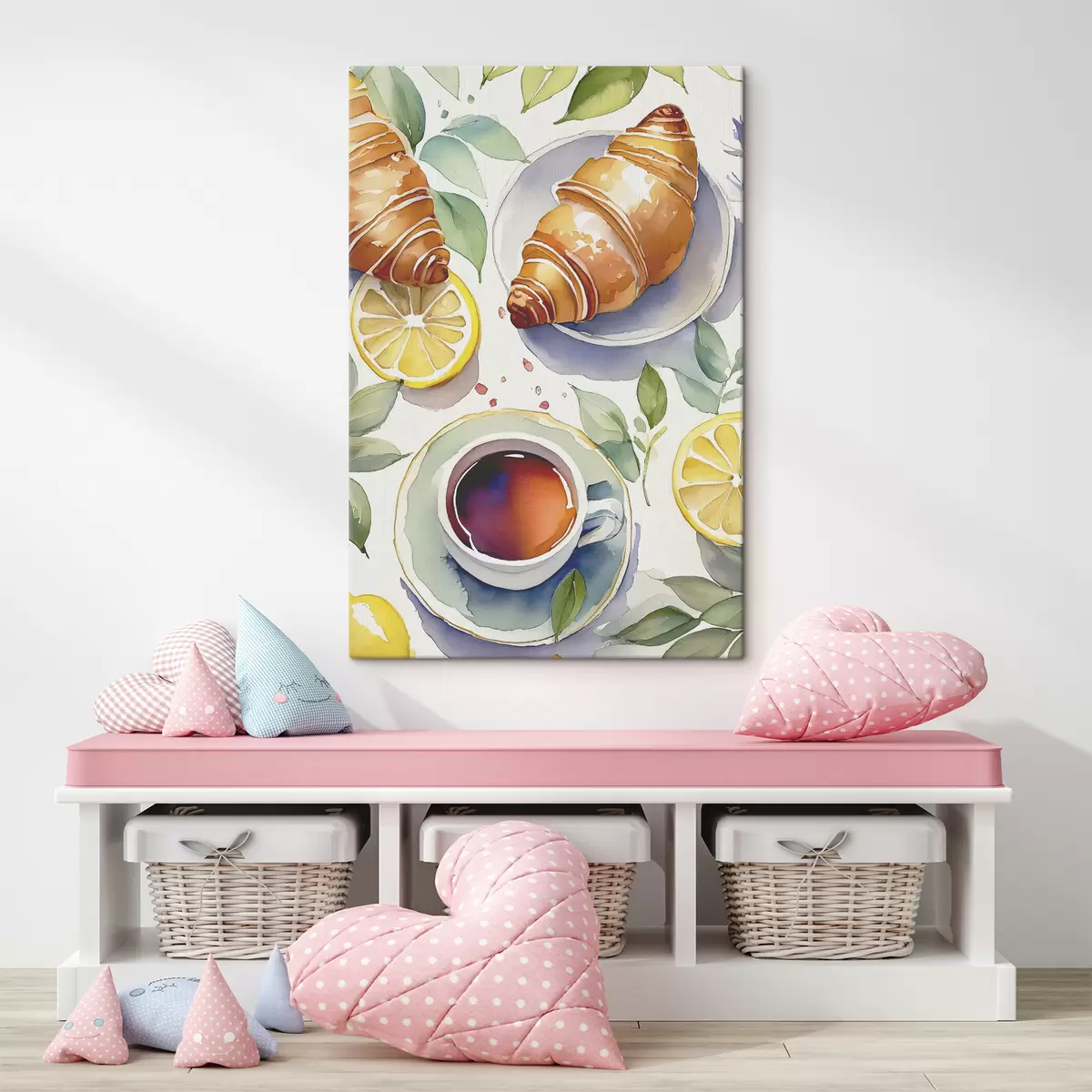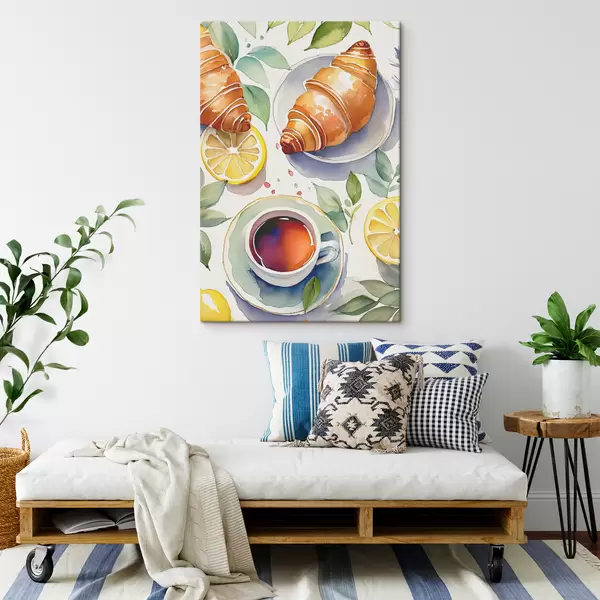 Peintures Aquarelle croissant, tasse de thé, petit déjeuner, citrons, style rustique s38389