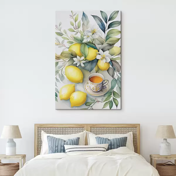 Peinture Citrons et fleurs, aquarelle, petit déjeuner, tasse de thé, style bohème Art. s38403
