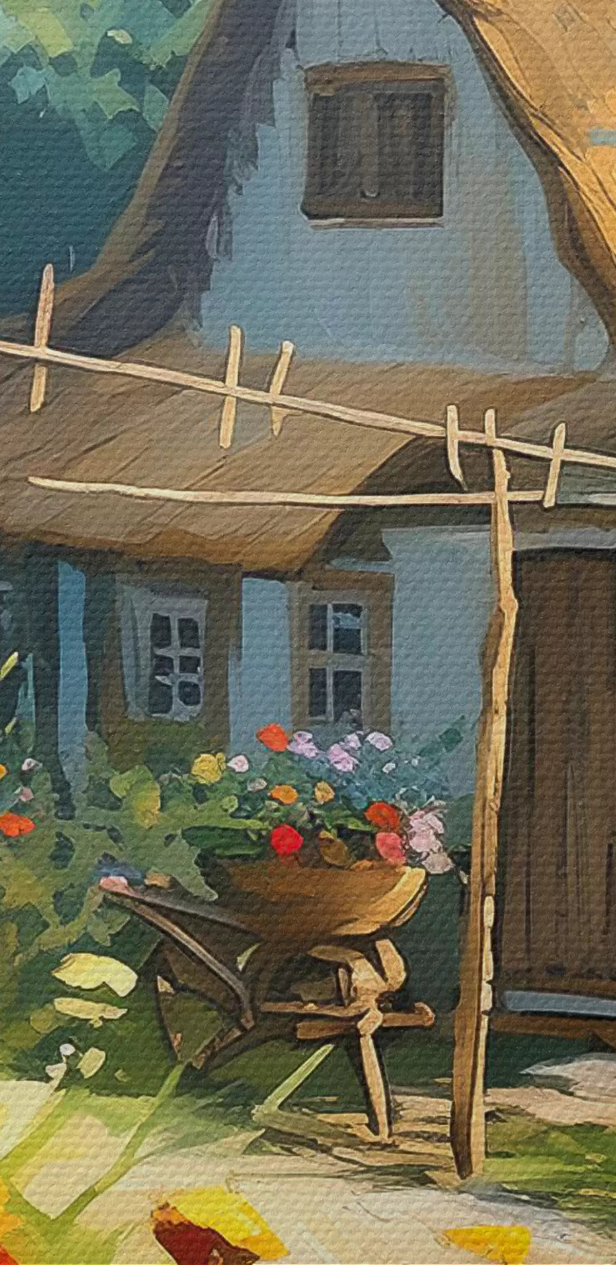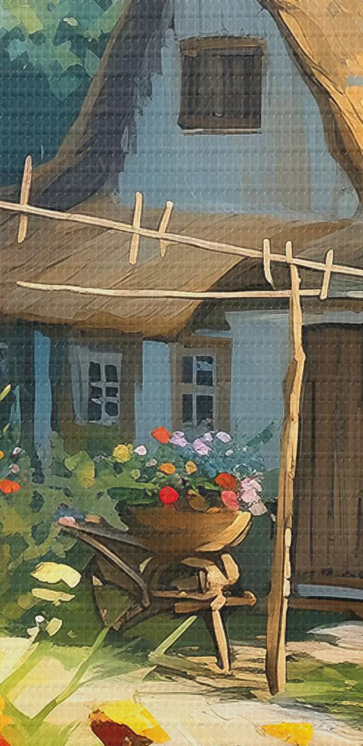 Peinture Maison de village avec jardin, fleurs d'été, peinture à l'huile, coups de pinceau, champ, style rustique Art. s38491
