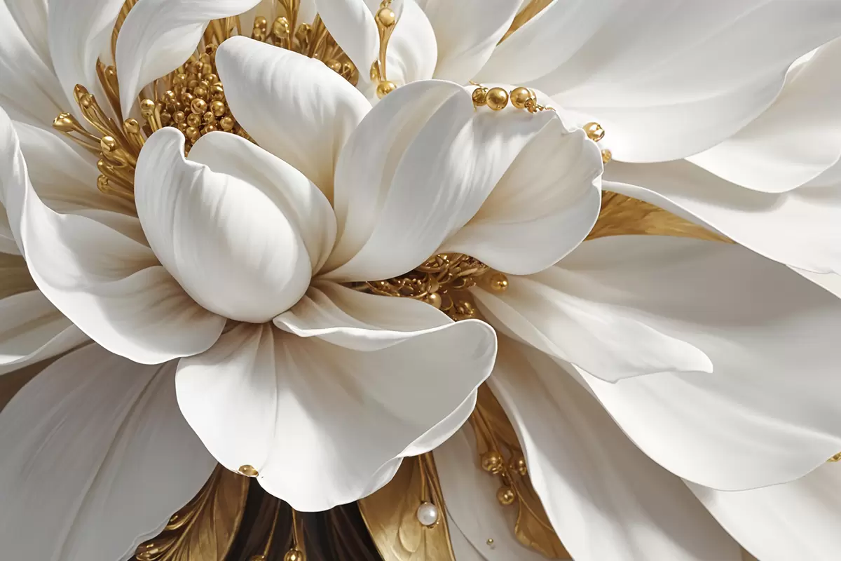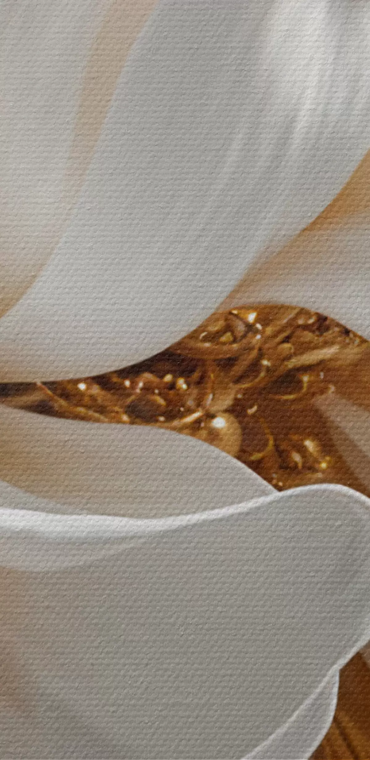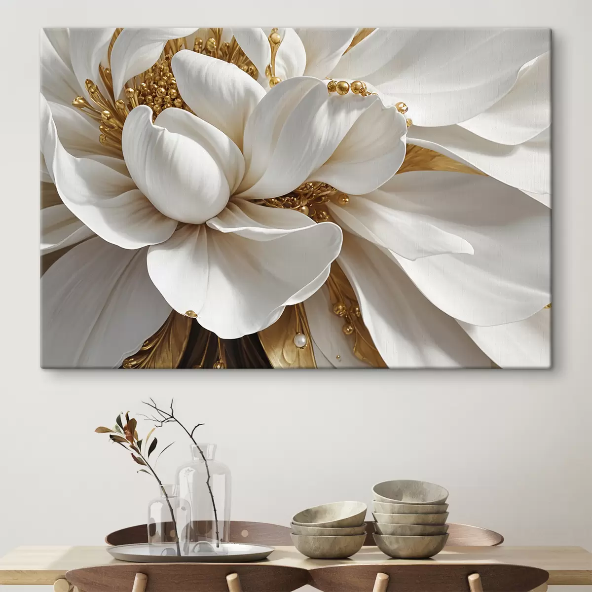 Peinture Gros plan sur une grande fleur blanche aux pétales et étamines délicats au centre du minimalisme. Art. s38762