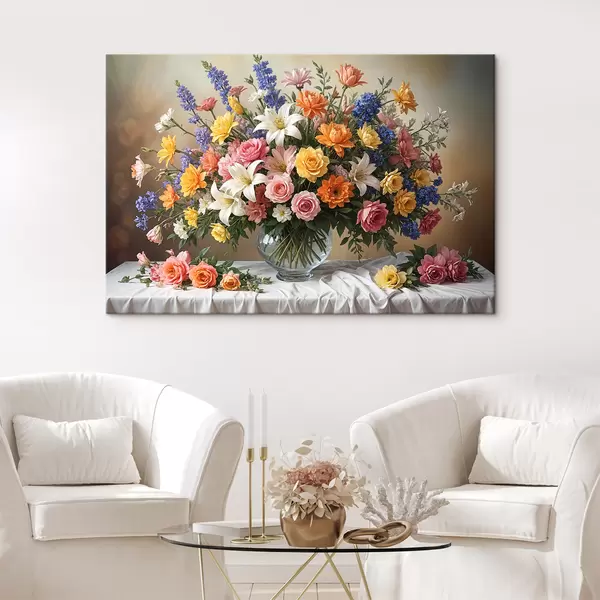 Peinture Un bouquet vibrant de diverses fleurs colorées dans un vase en verre sur une nappe blanche, peinture d'art vintage Art. s38825
