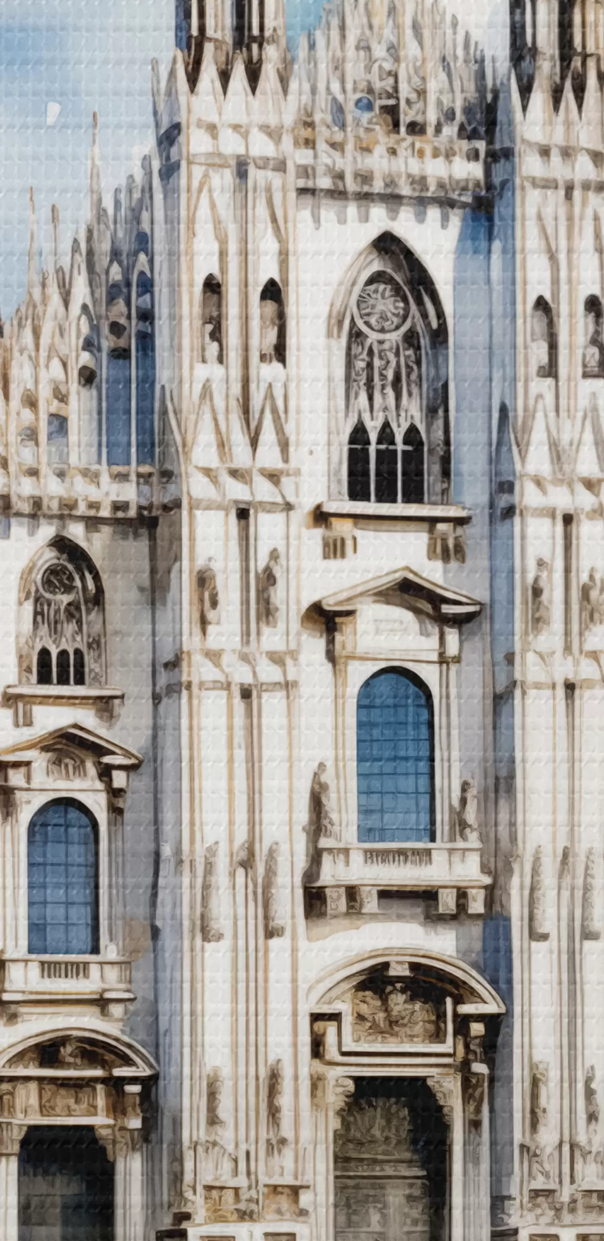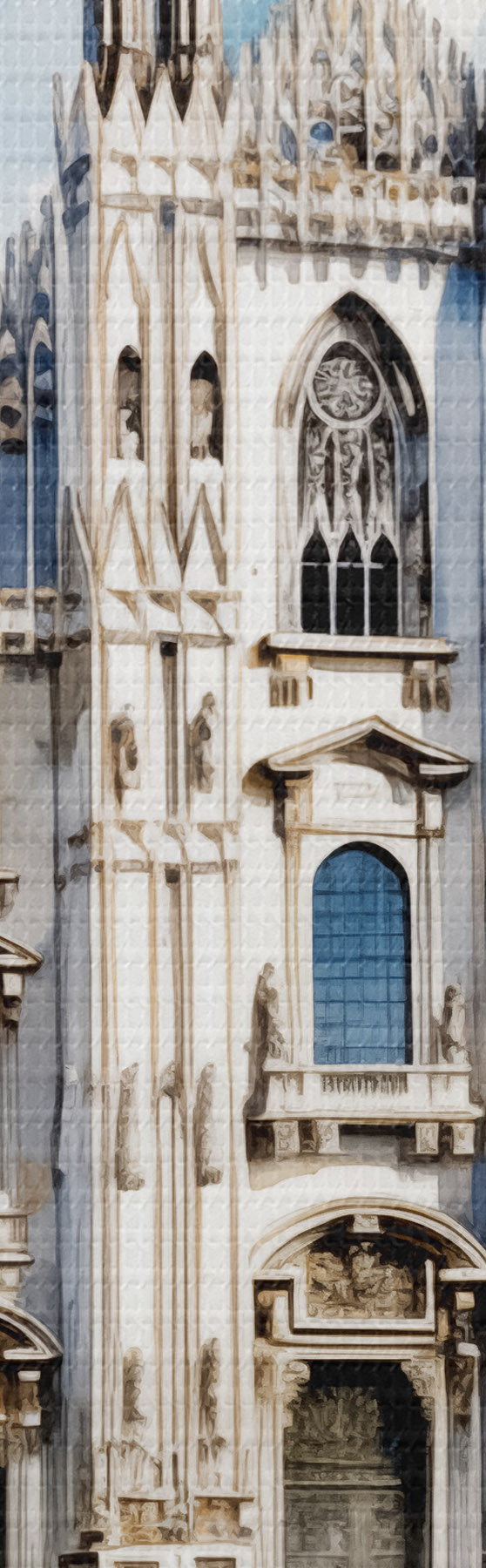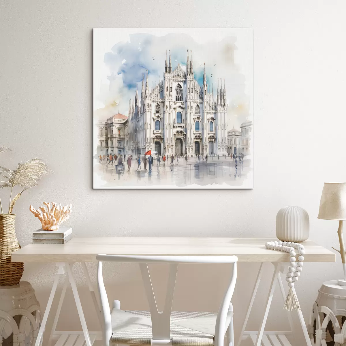 Peinture Cathédrale Duomo de Milan, architecture, ville, pluie, aquarelle, bleu, gris, passants Art. s38938
