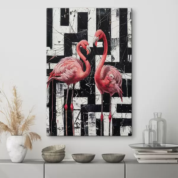 Peintures Deux flamants roses debout devant une peinture d'art de fond abstrait noir et blanc s38954