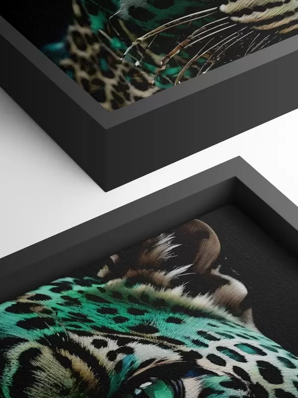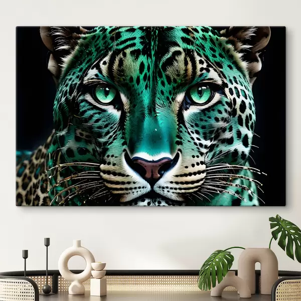 Peintures Un portrait en gros plan d'un féroce léopard aux yeux verts avec une fourrure tachetée de turquoise et de noir éclatant s38979