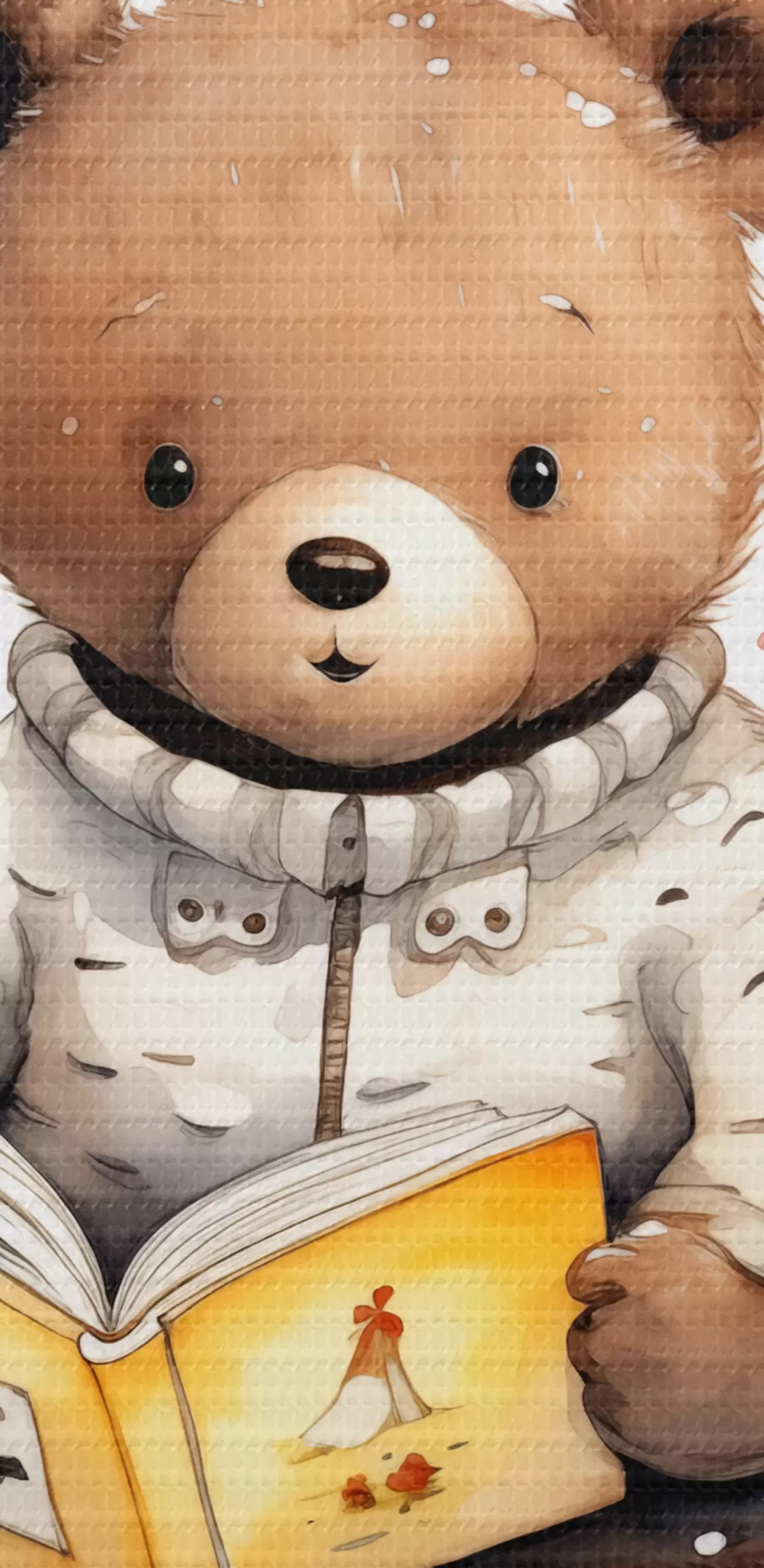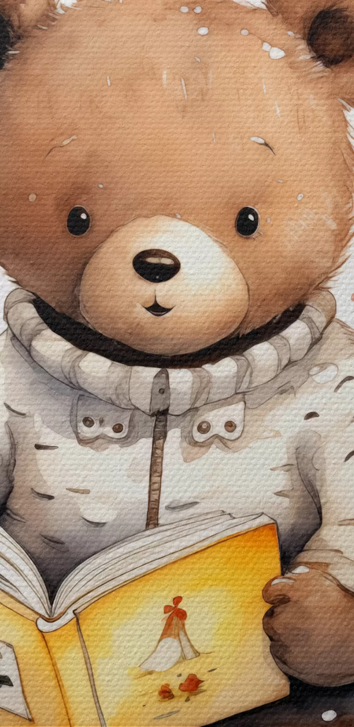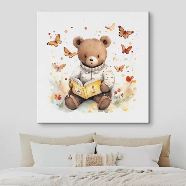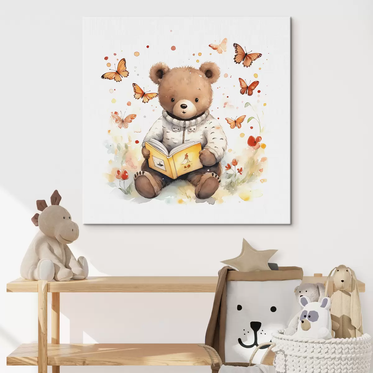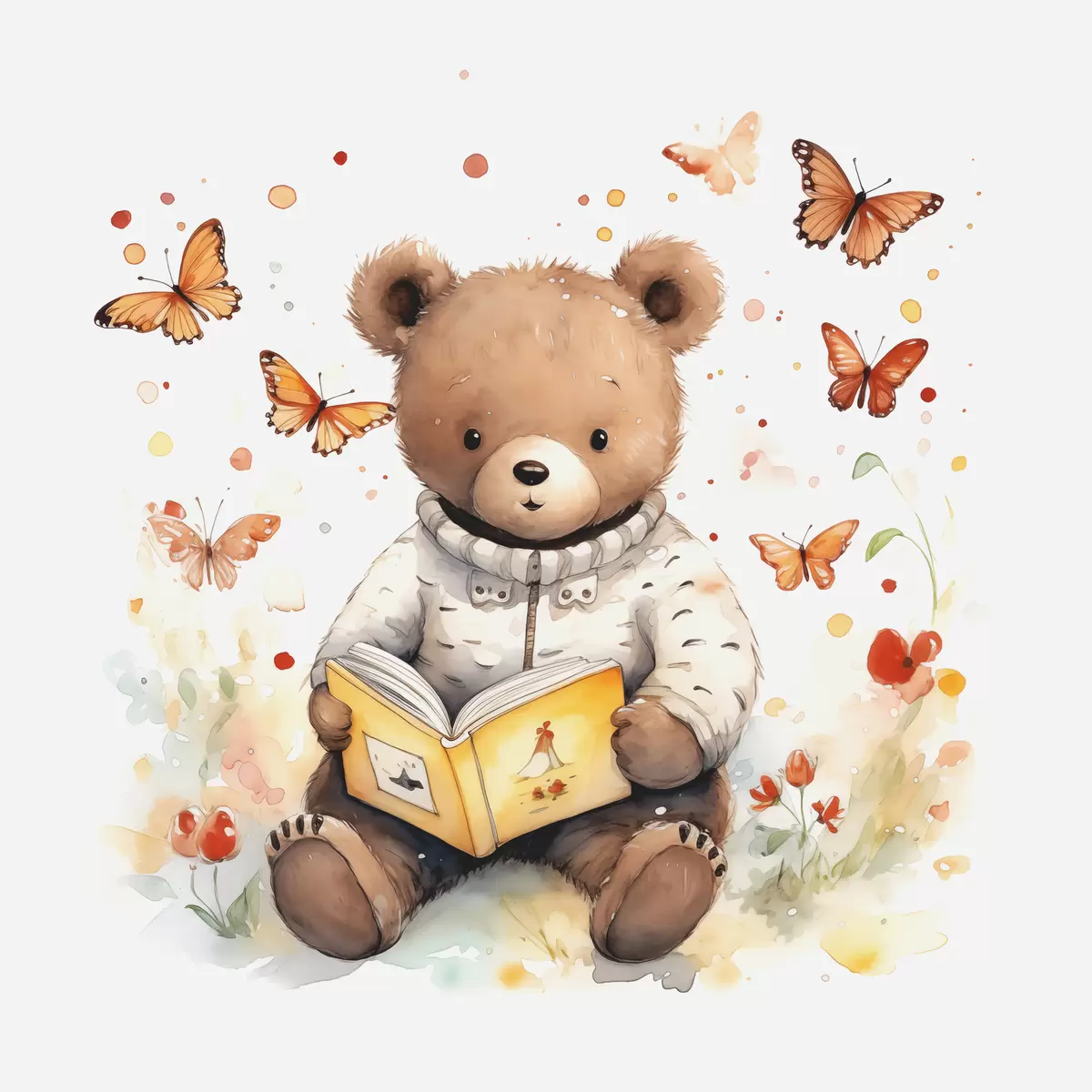 Peinture Ourson brun dans un pull lit un livre entouré de papillons aquarelles Art. s39025