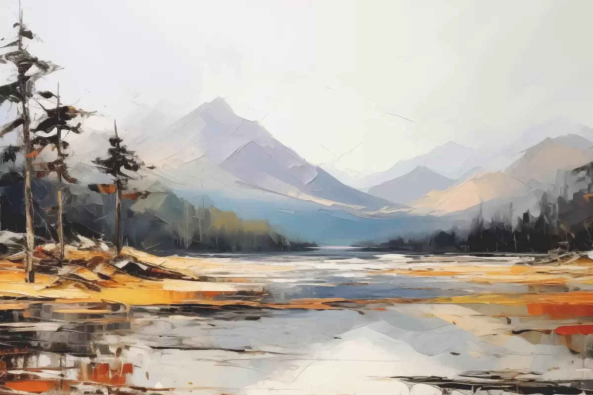Peinture Chaînes de montagnes dans la peinture à l'huile de la vallée, paysage, nature, bleu, couleur jaune blanc Art. s39128
