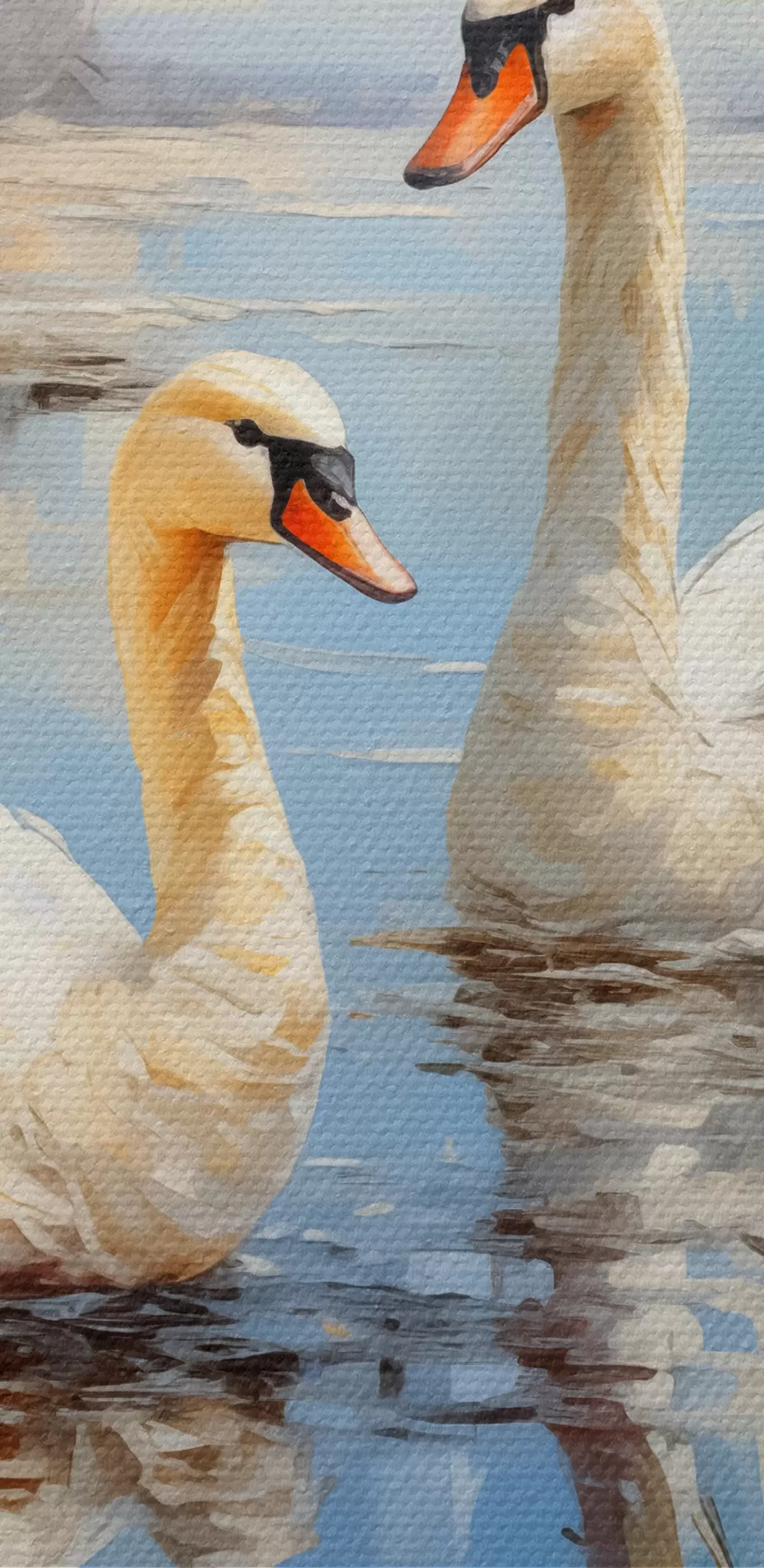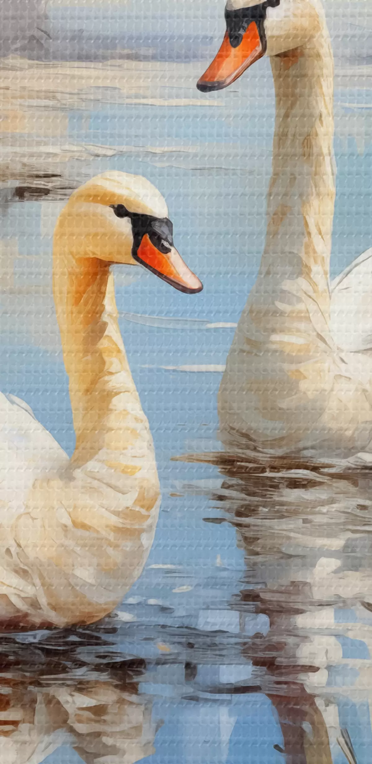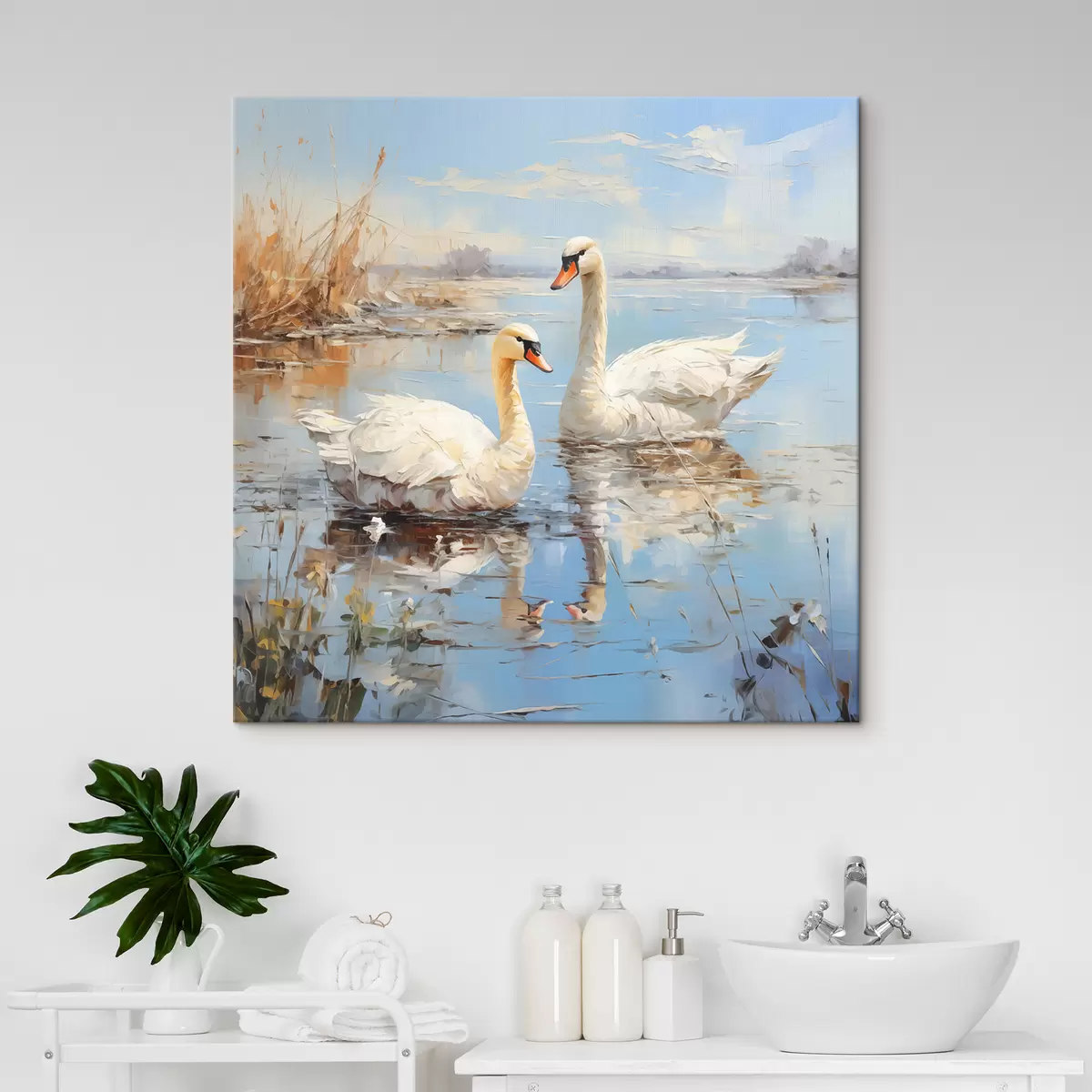 Peinture Les oies blanches nagent le long de la rivière parmi les roseaux, de couleur bleue, blanche et beige Art. s39130