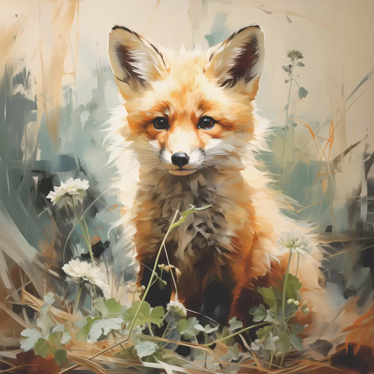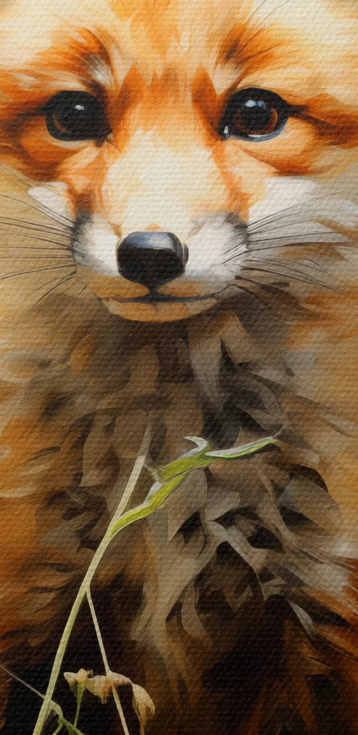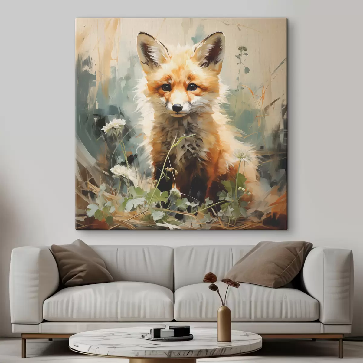 Peinture Renard roux assis dans l'herbe sèche sur une peinture à l'huile de fond vert Art. s39191