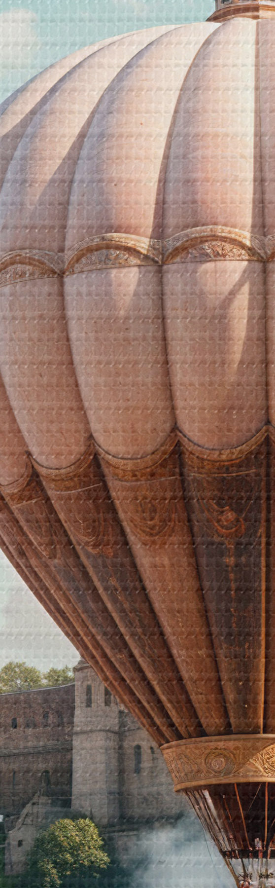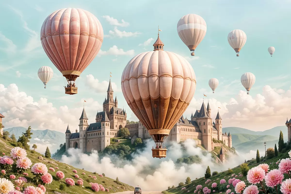 Peintures Un château fantastique entouré de montgolfières roses flottant dans un ciel nuageux au-dessus d'un paysage verdoyant et luxuriant s39387
