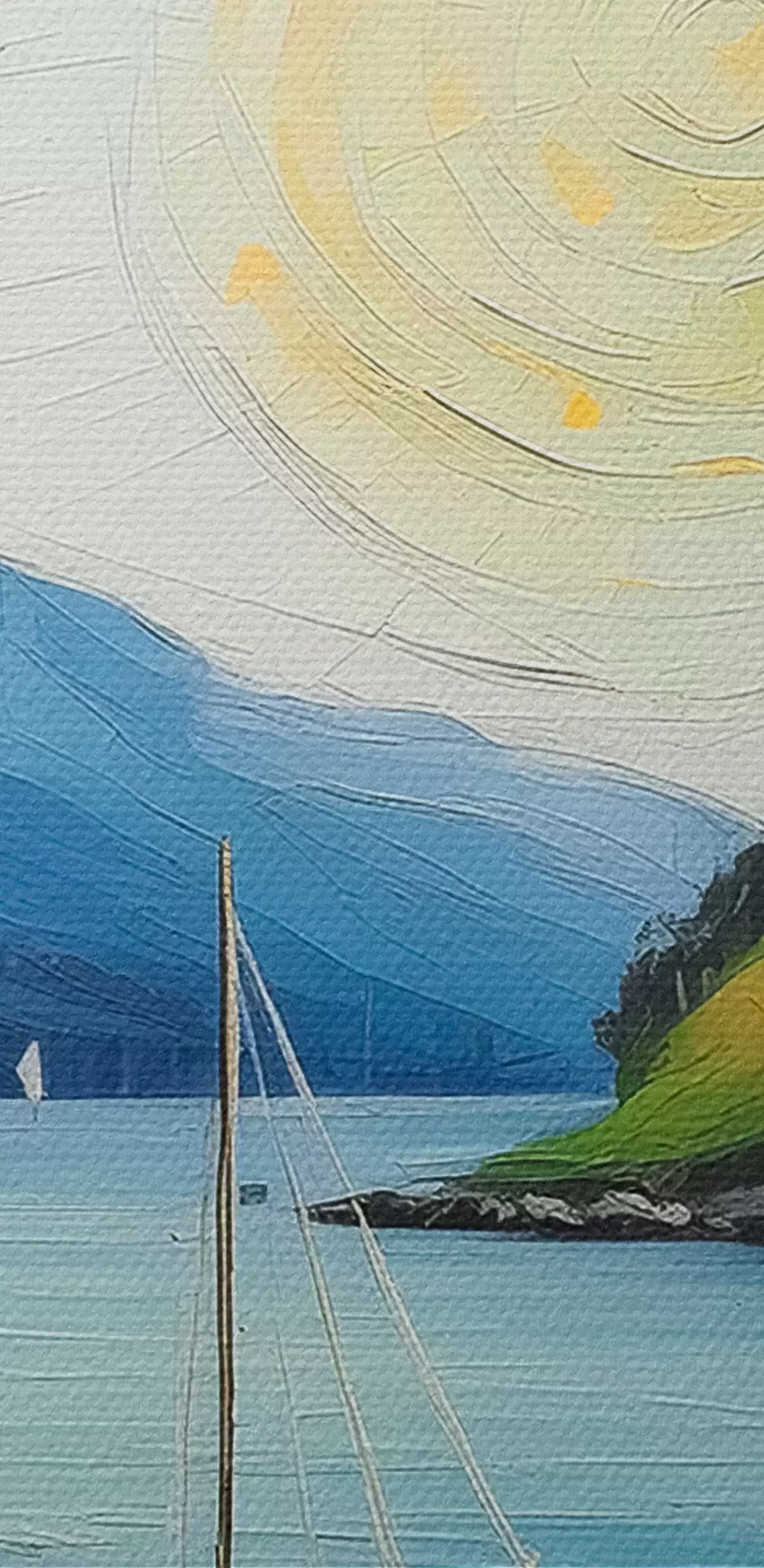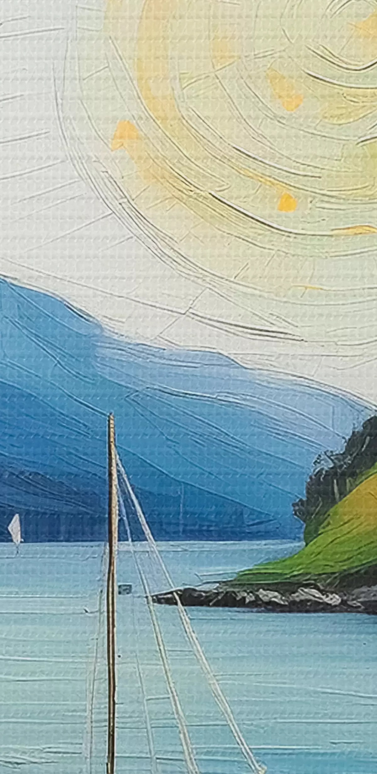 Peinture Été nordique, petite maison au bord de la mer, soleil dans le ciel bleu, montagnes Art. s39423