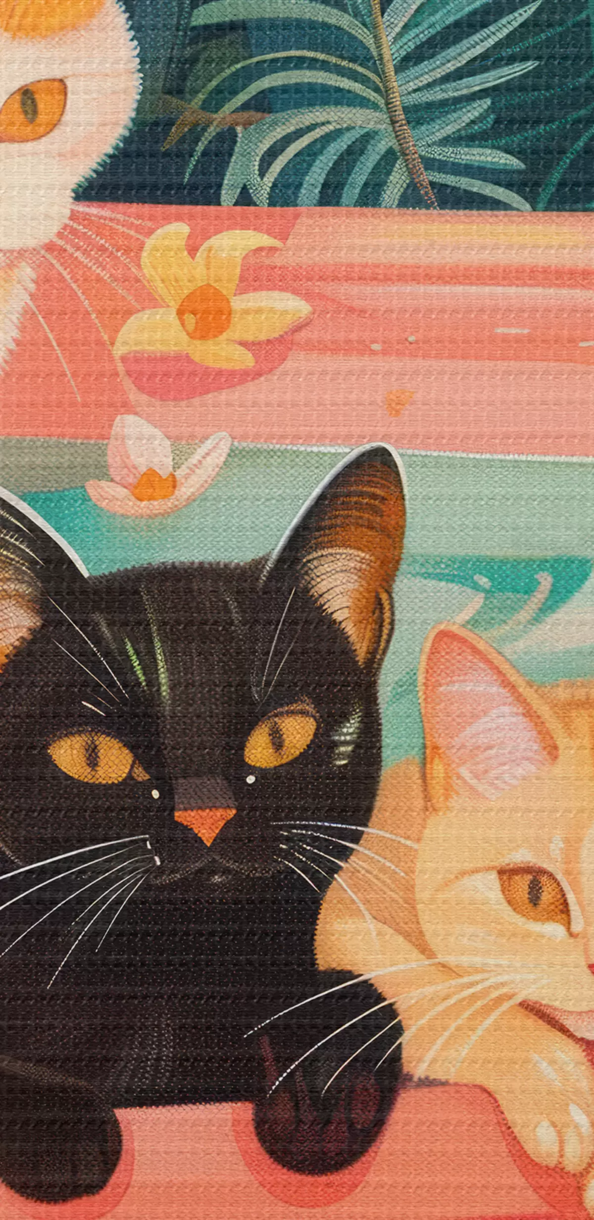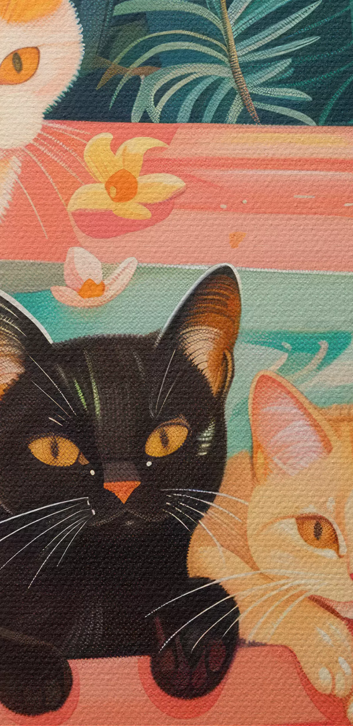 Peinture Chats dans un bain rose aux feuilles vertes, ambiance jungle Art. s39465