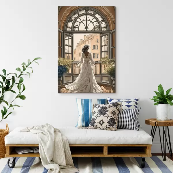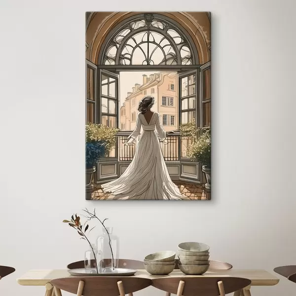 Peinture silhouette d'une jeune fille vêtue d'une robe blanche près d'une grande fenêtre Art. s39480