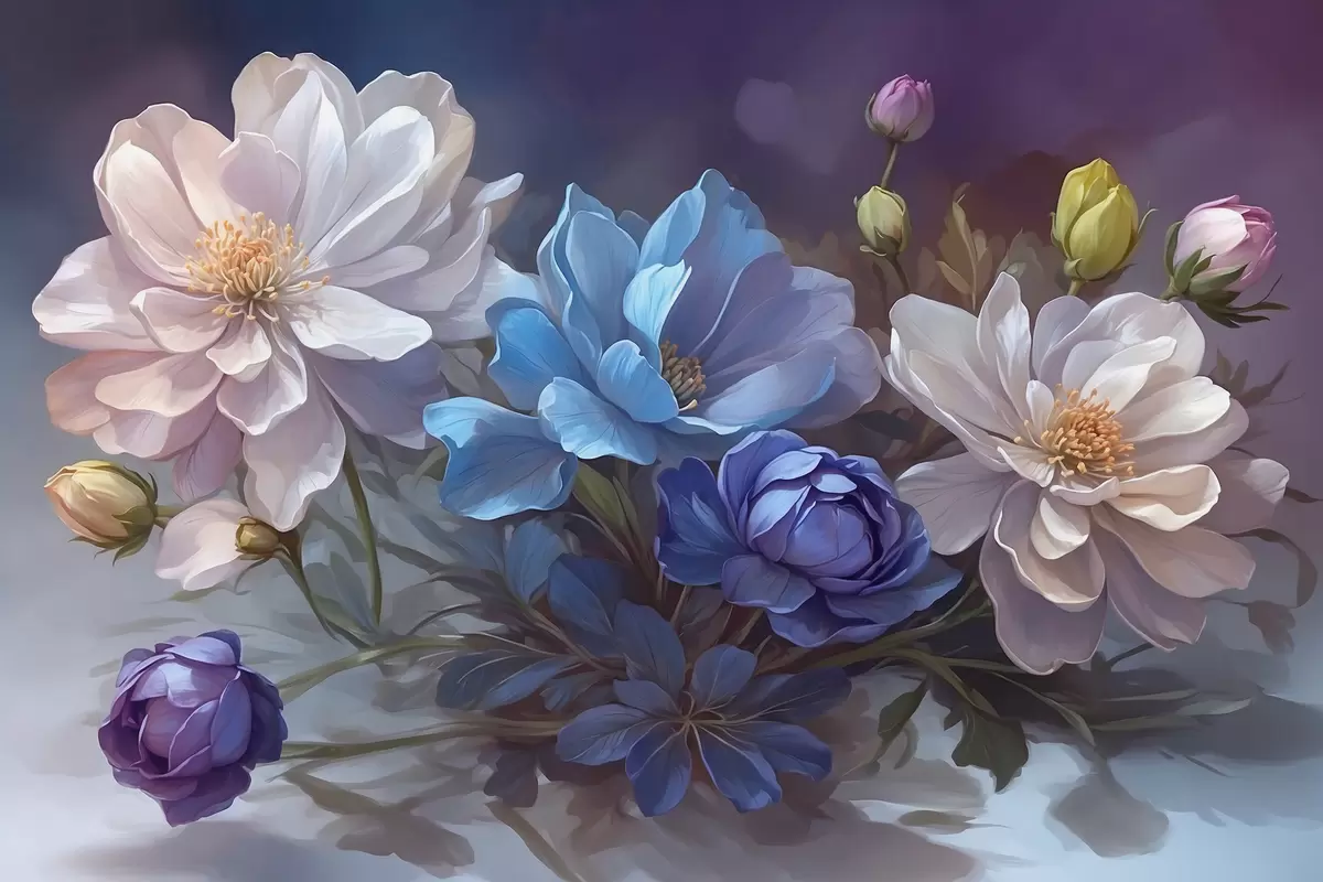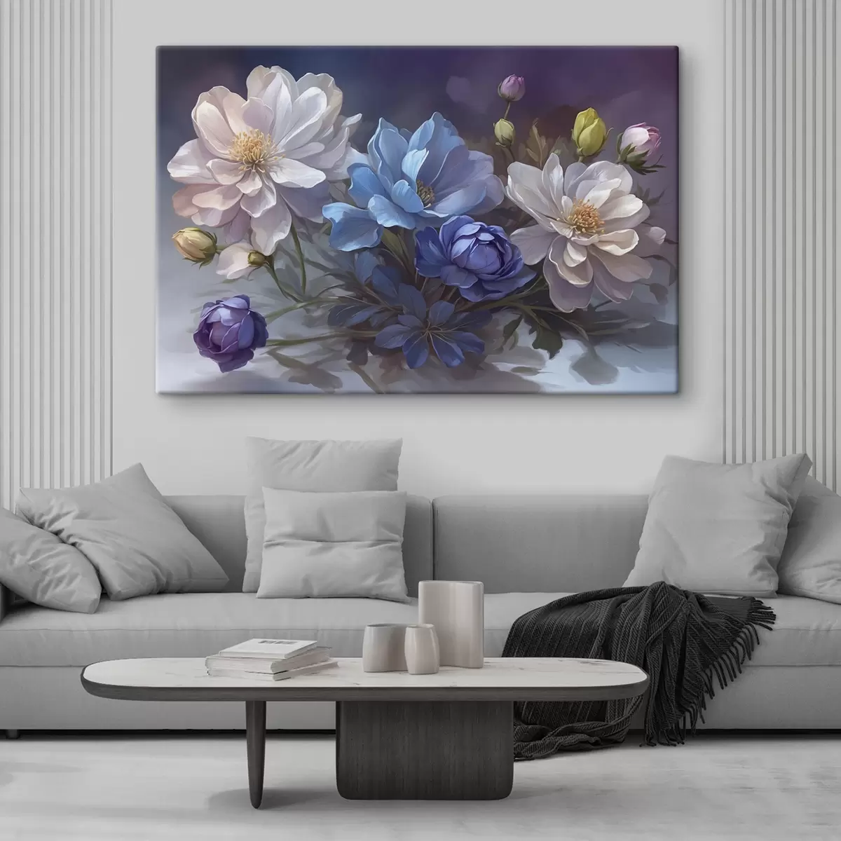 Peinture Fleurs blanches et bleues sur fond flou Art. s39603