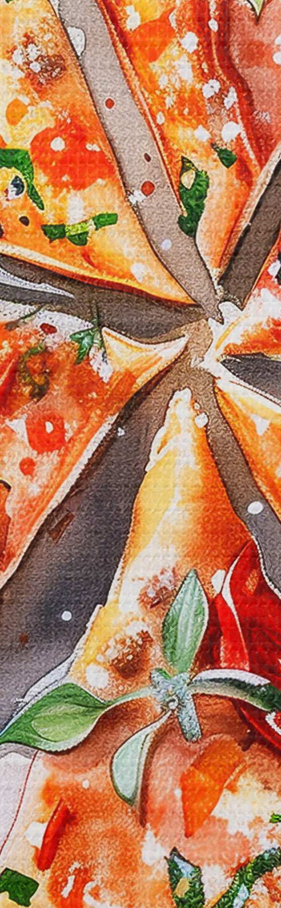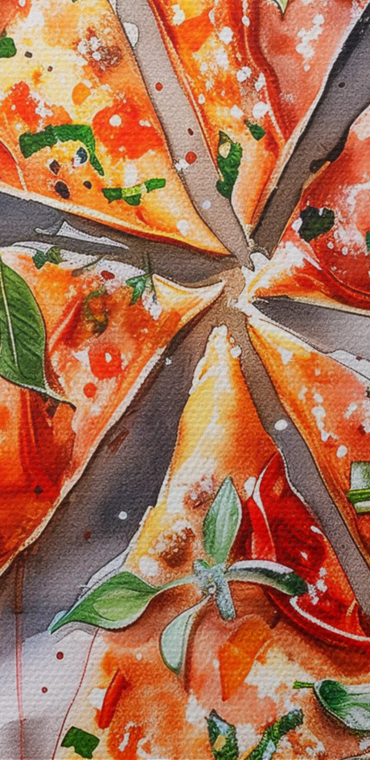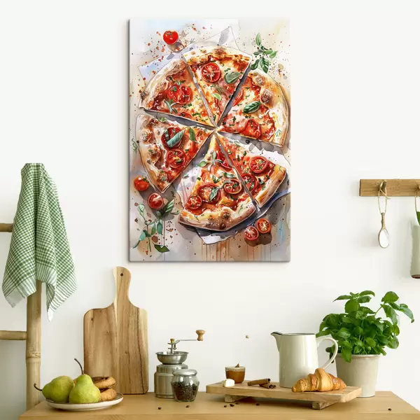 Peinture Pizza aquarelle, délicieuse, tomates et fromage, art culinaire, table en bois Art. s39704