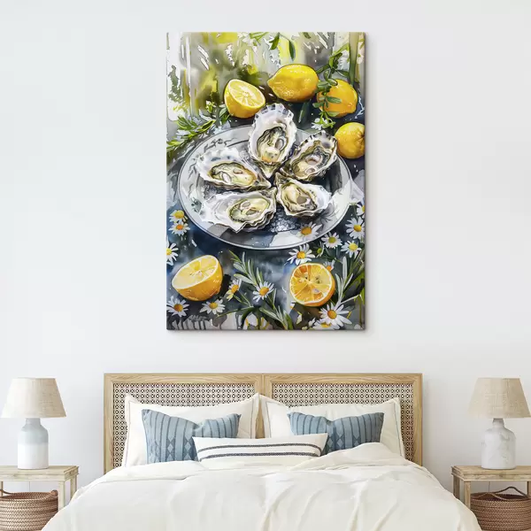 Peintures Huîtres élégantes dans l'assiette, citrons et fleurs, couleurs estivales, méditerranéennes s39710
