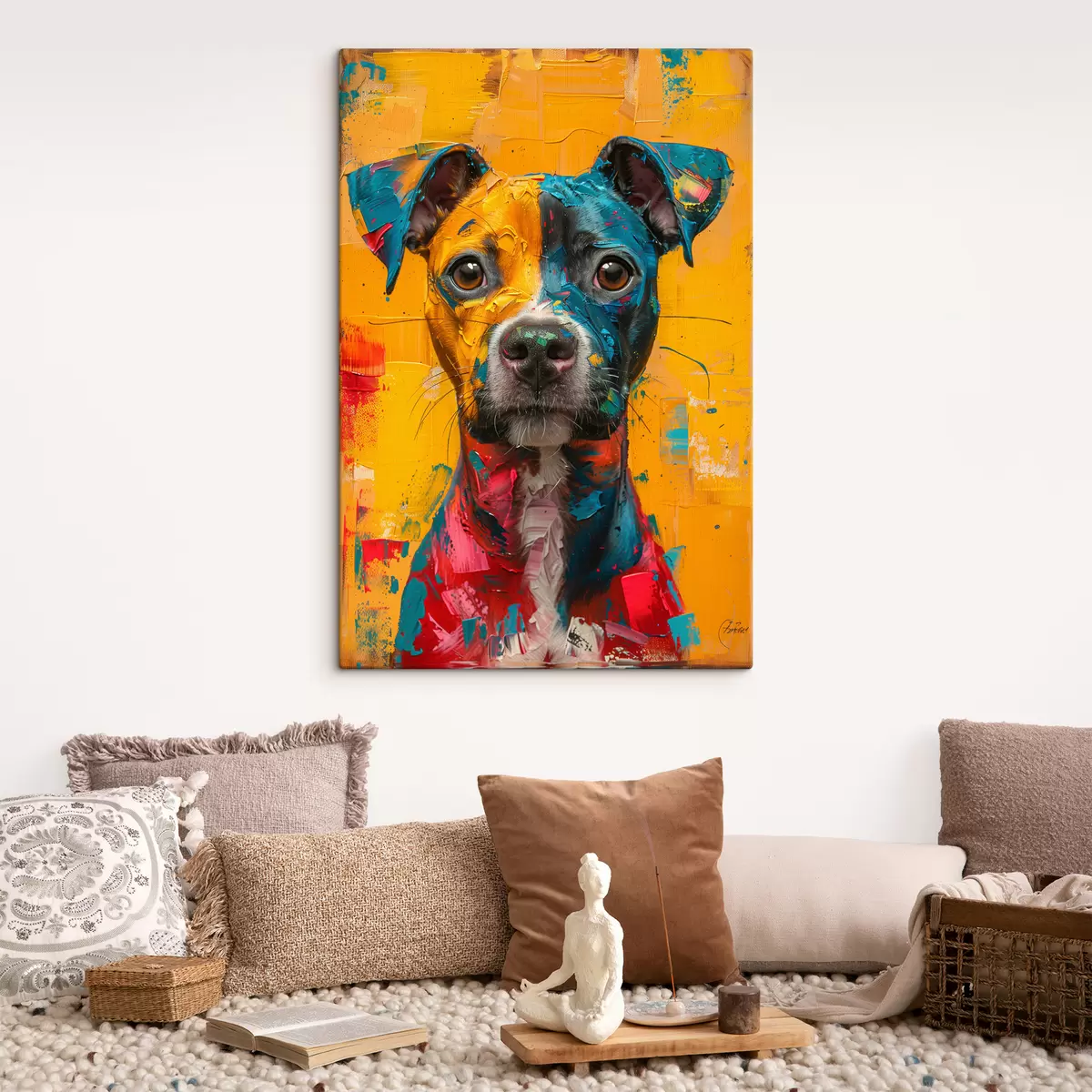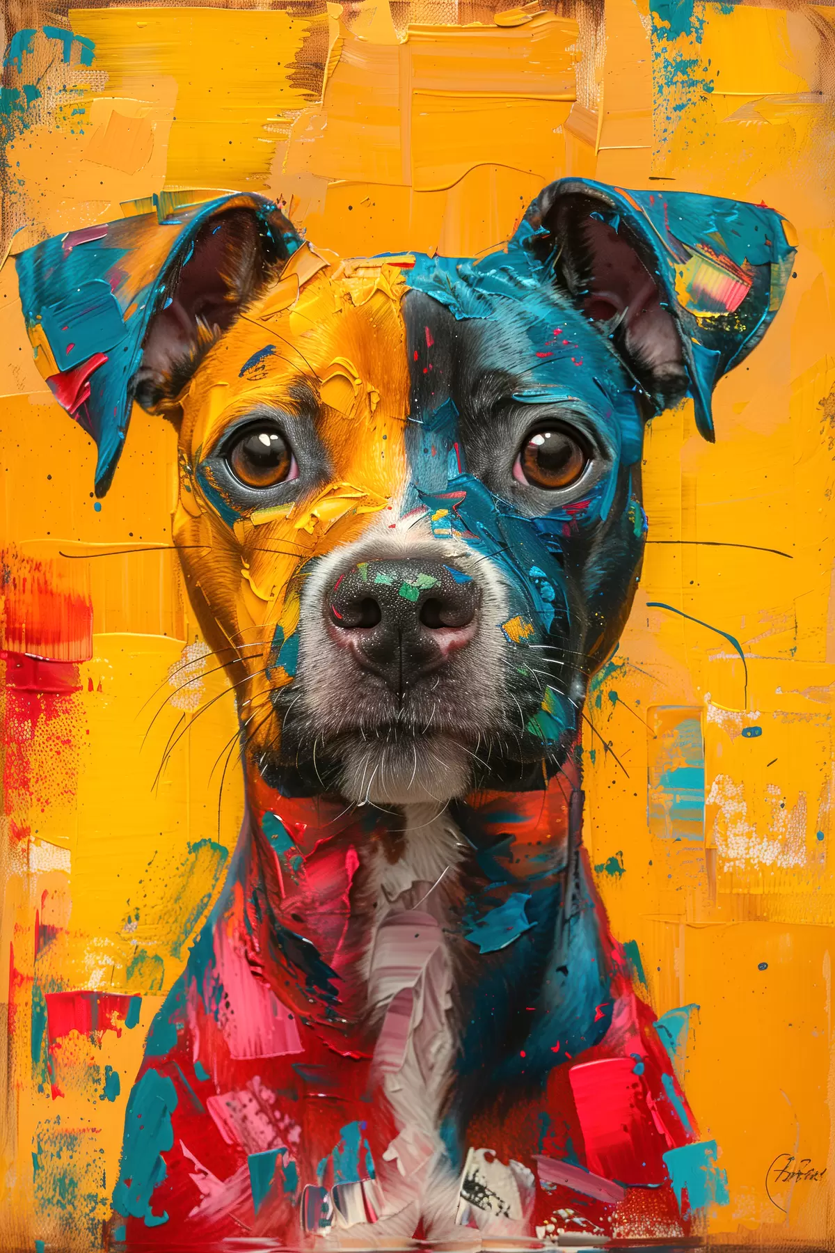 Peinture Portrait d'un Pitbull avec des coups de pinceau à huile jaune et bleu Art. s39722