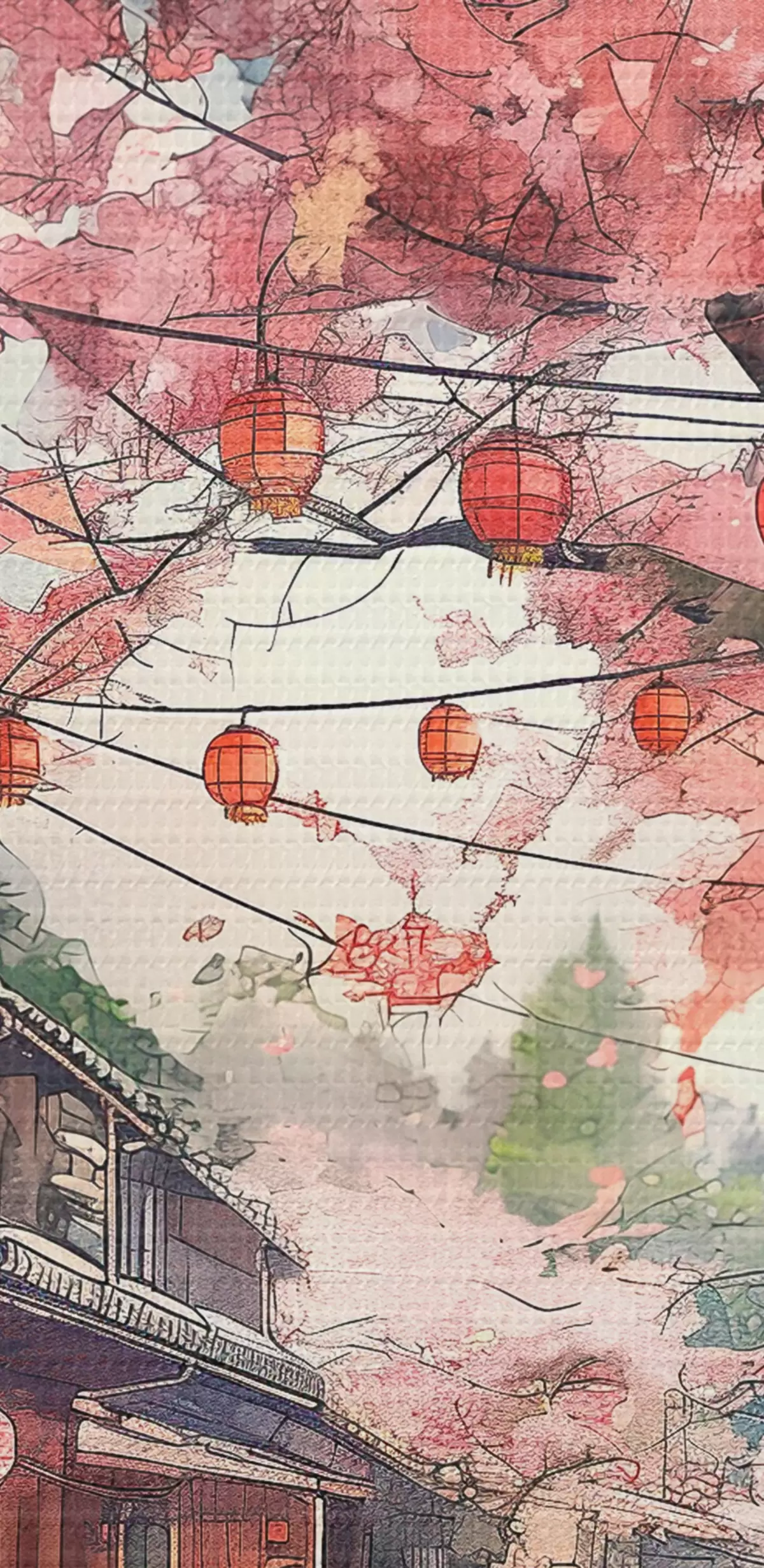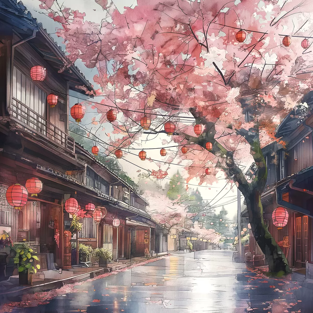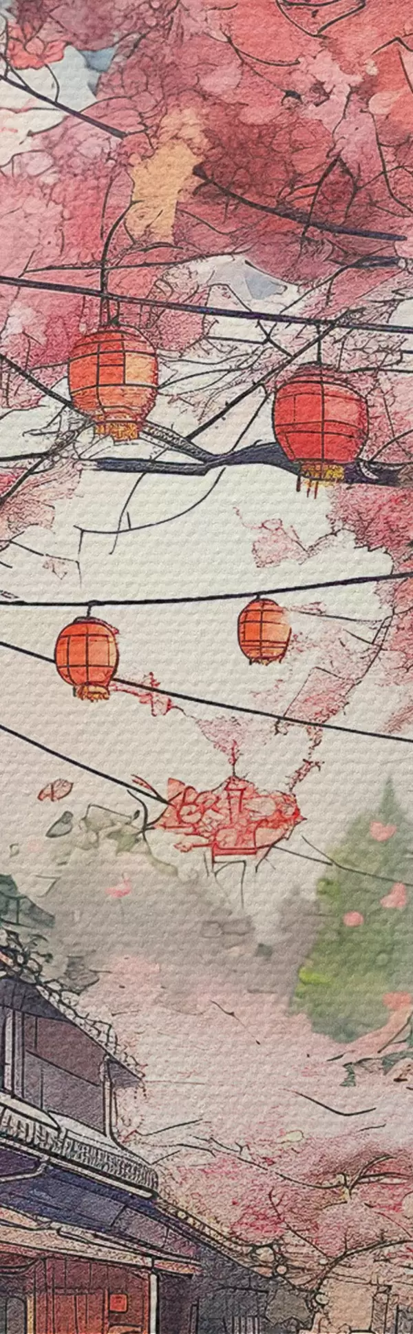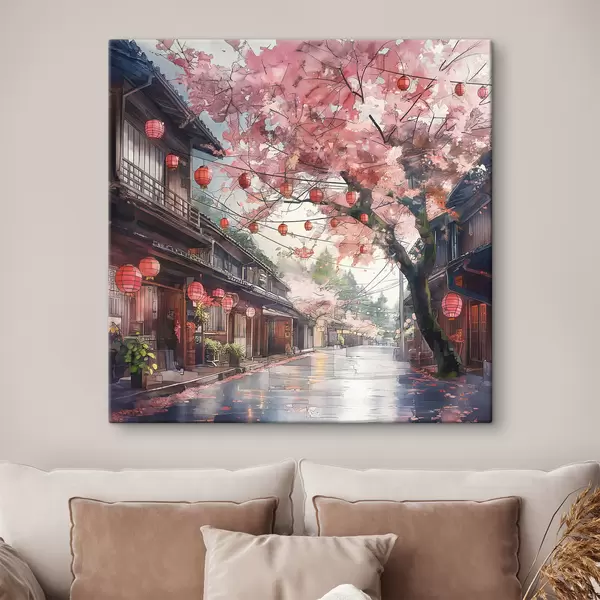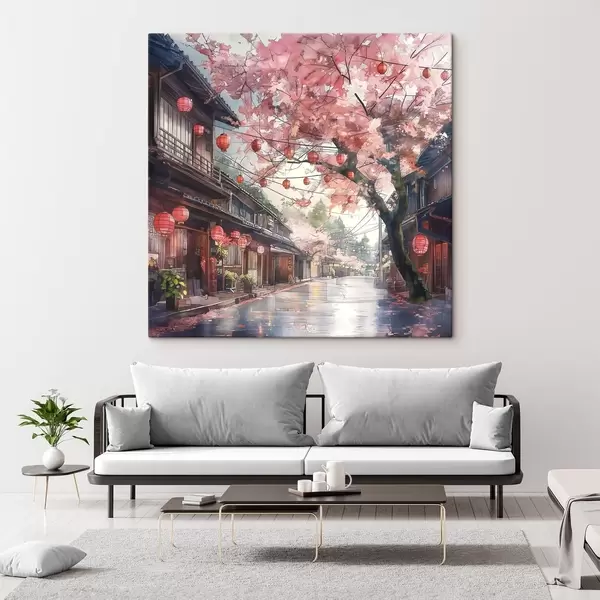 Peinture Rue japonaise avec cerisiers en fleurs, architecture orientale, lanternes Art. s39774