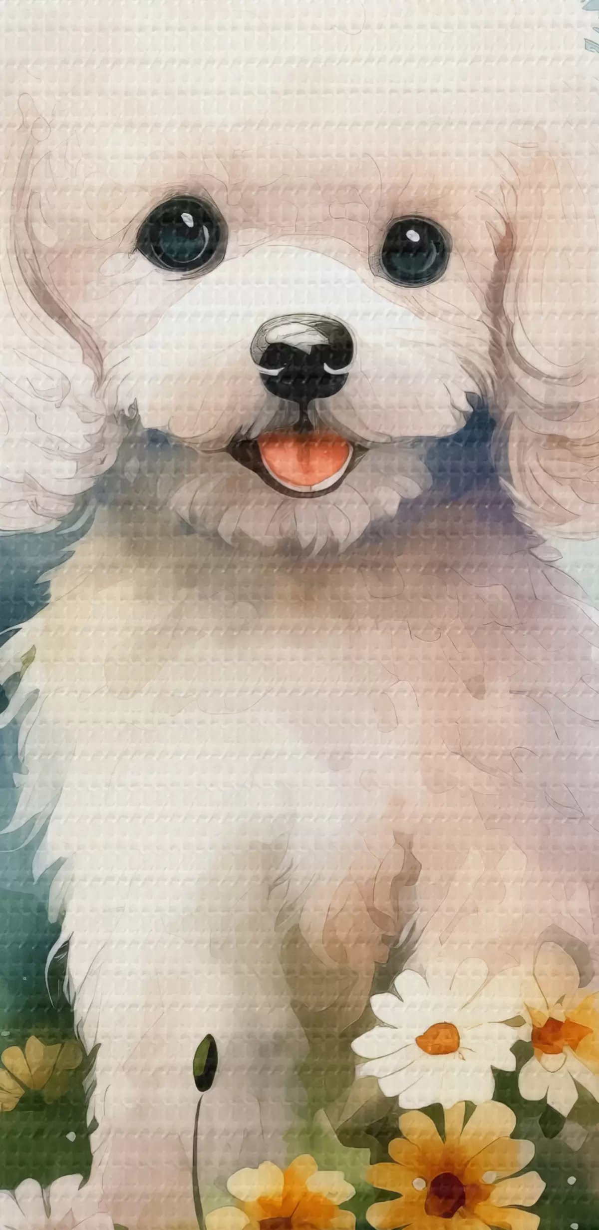 Peinture Aquarelle de petit caniche blanc assis dans des fleurs Art. s39928