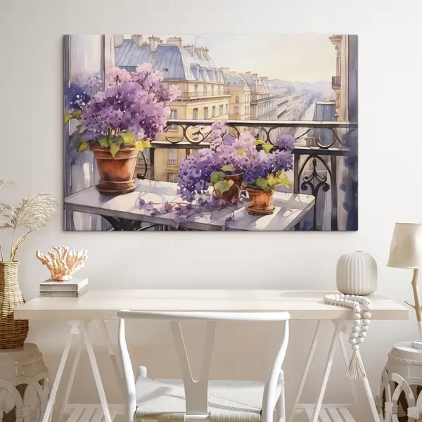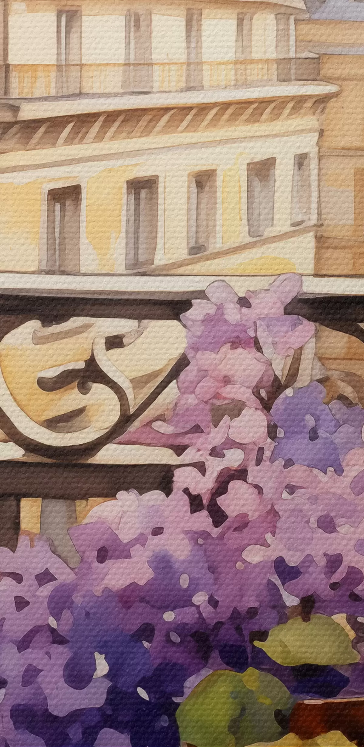 Peinture Violettes en pot sur un balcon à Paris aquarelle Art. s39931