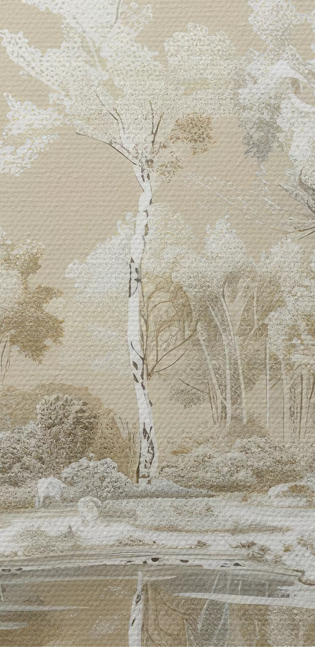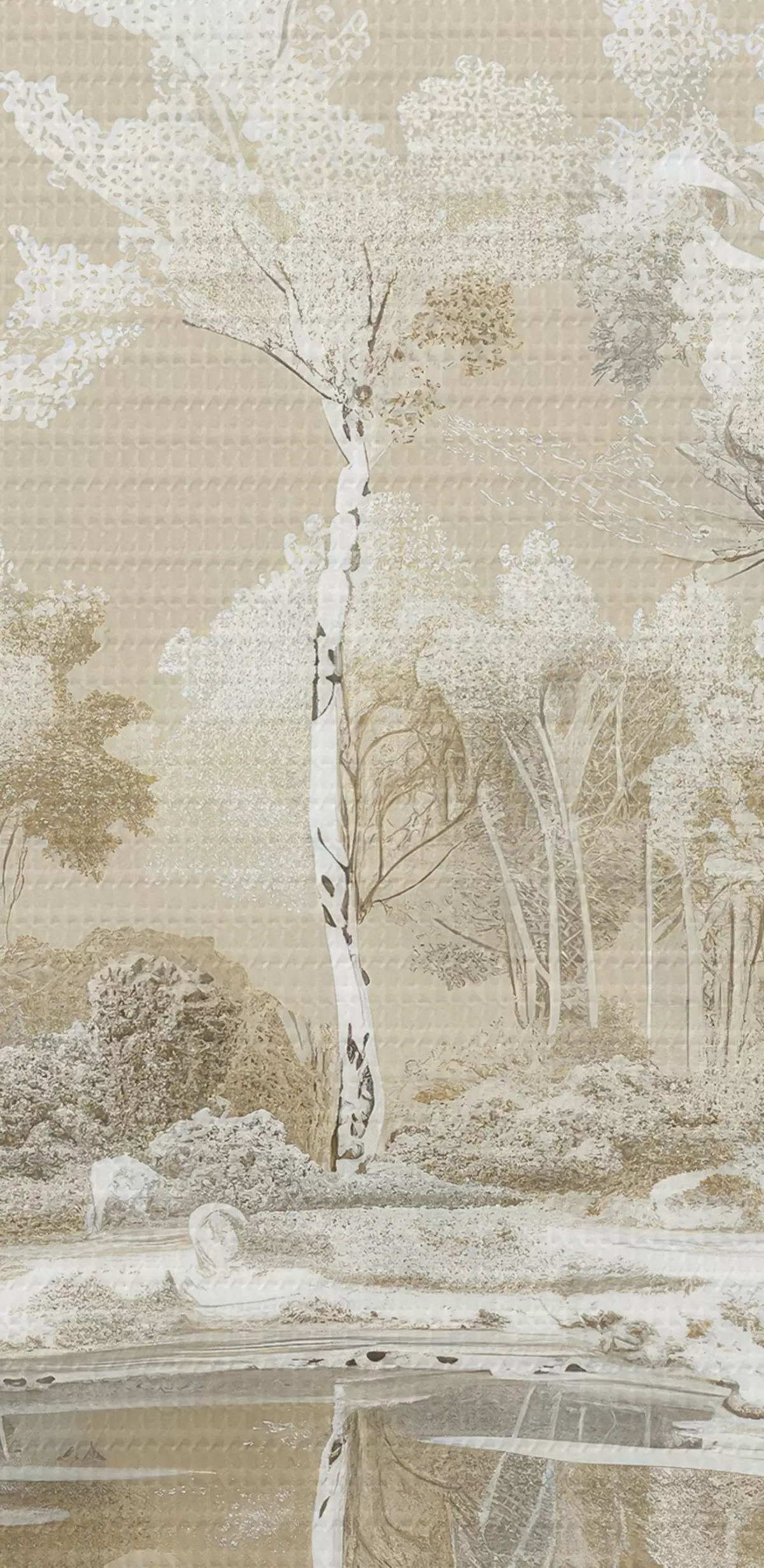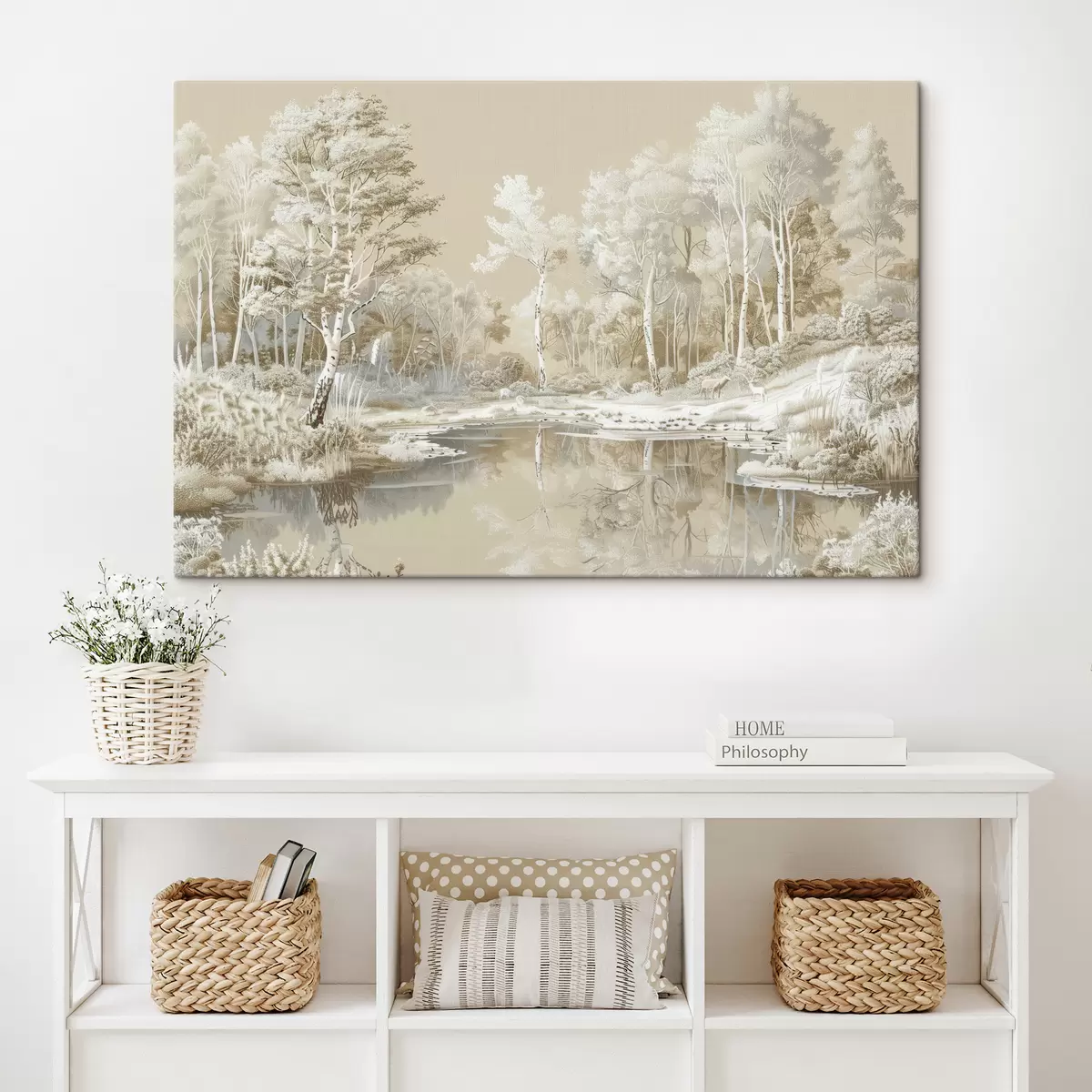 Peinture Magnifique paysage forestier, étang et arbres, couleurs beige et blanc Art. s39979