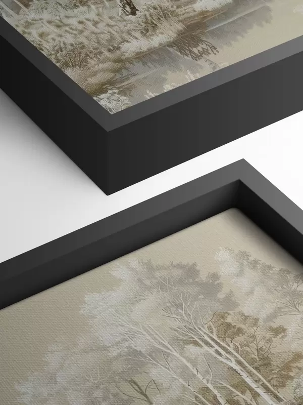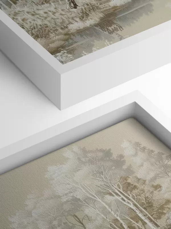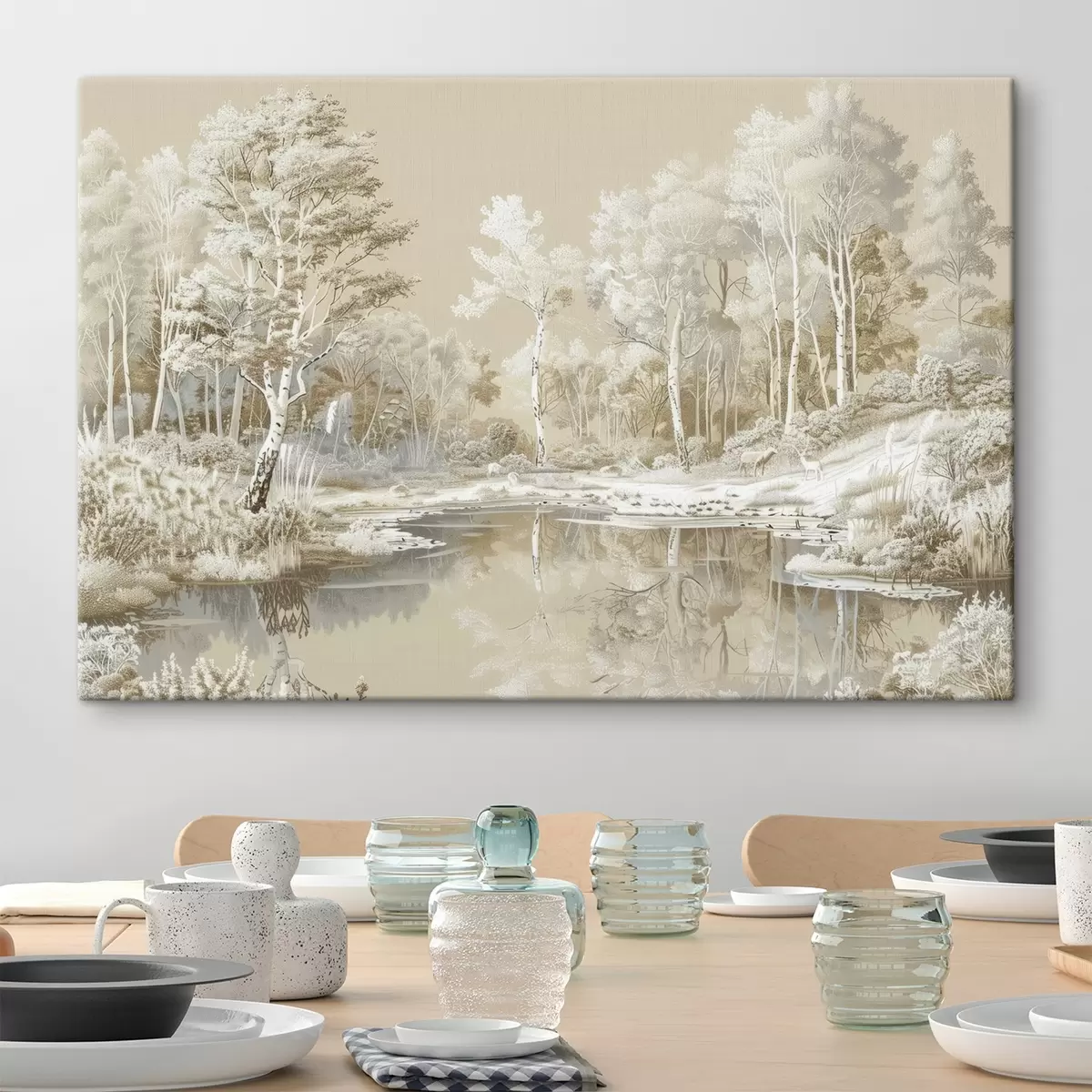 Peintures Magnifique paysage forestier, étang et arbres, couleurs beige et blanc s39979