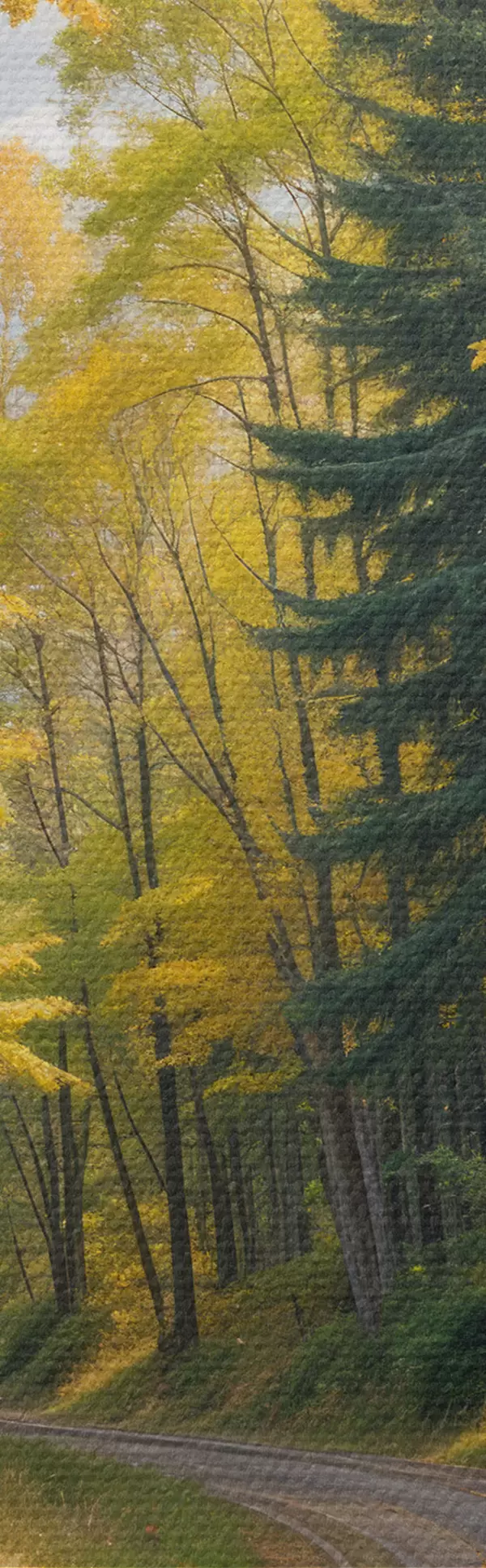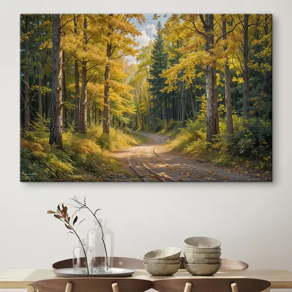 Peinture Un chemin de terre serpentant à travers une forêt en automne, avec de grands arbres des deux côtés Art. s40031